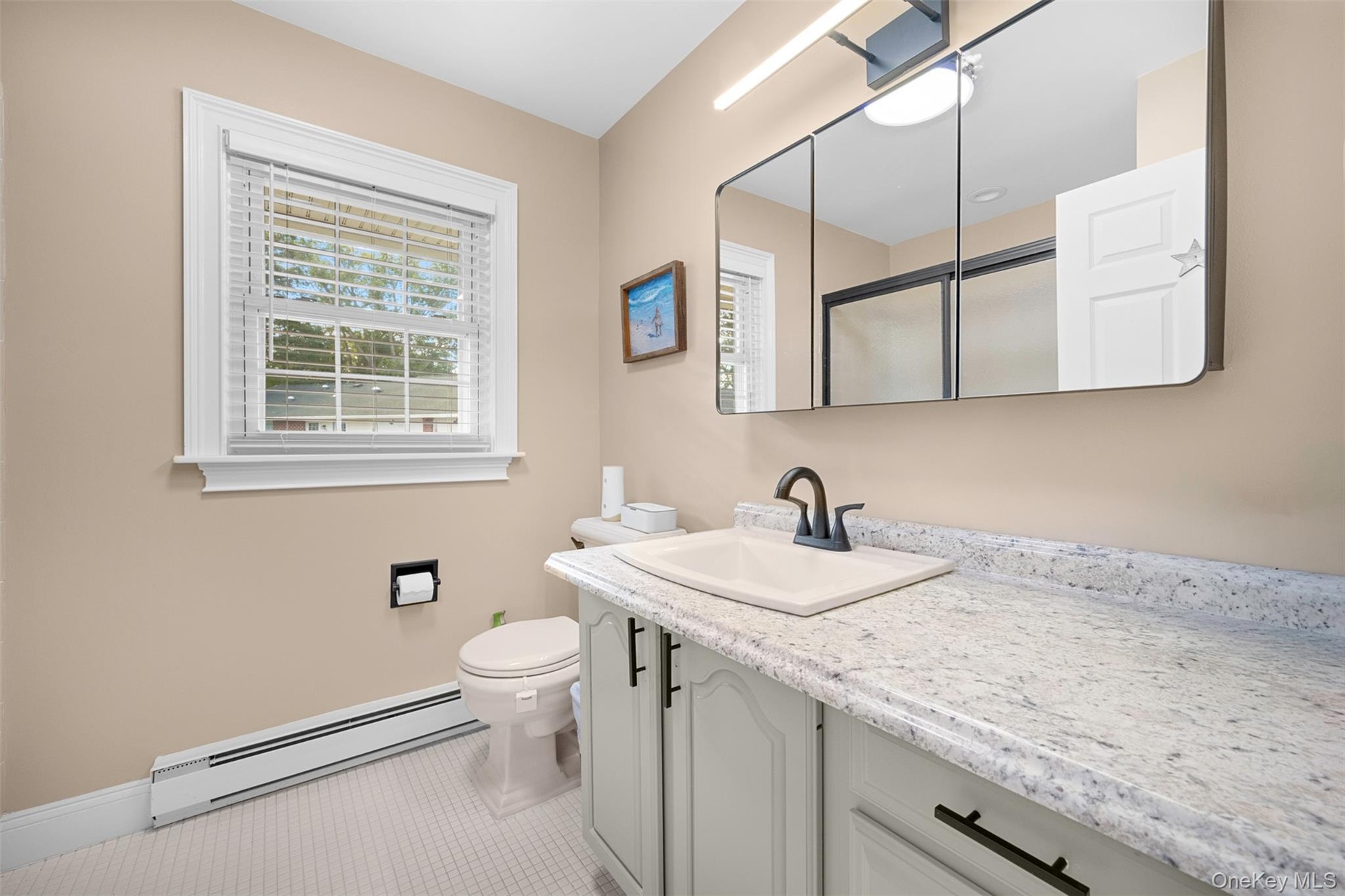 - Bathroom with a stall shower, vanity, baseboard heating, and light tile patterned floors