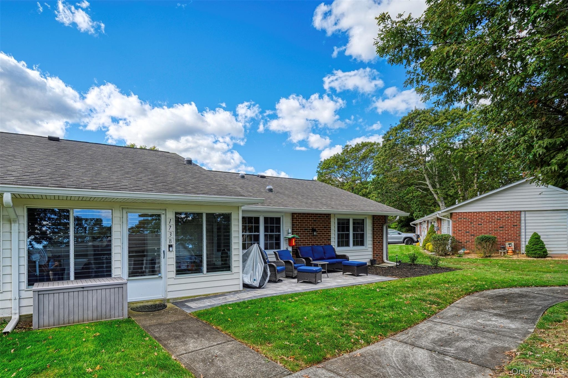 - Back of house with a patio, a lawn, a shingled roof, and an outdoor living space