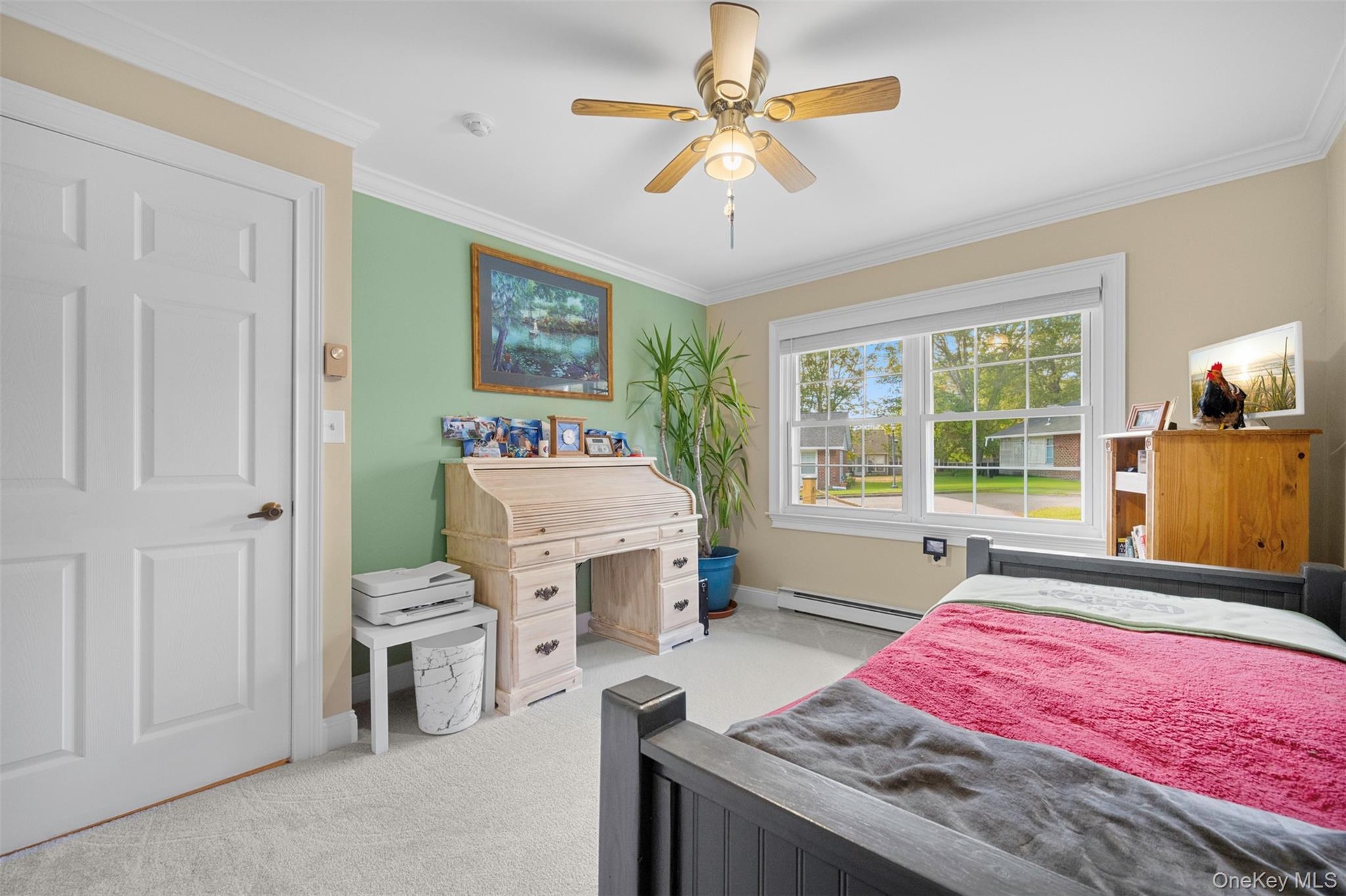 - Bedroom with crown molding, light colored carpet, ceiling fan, and baseboard heating
