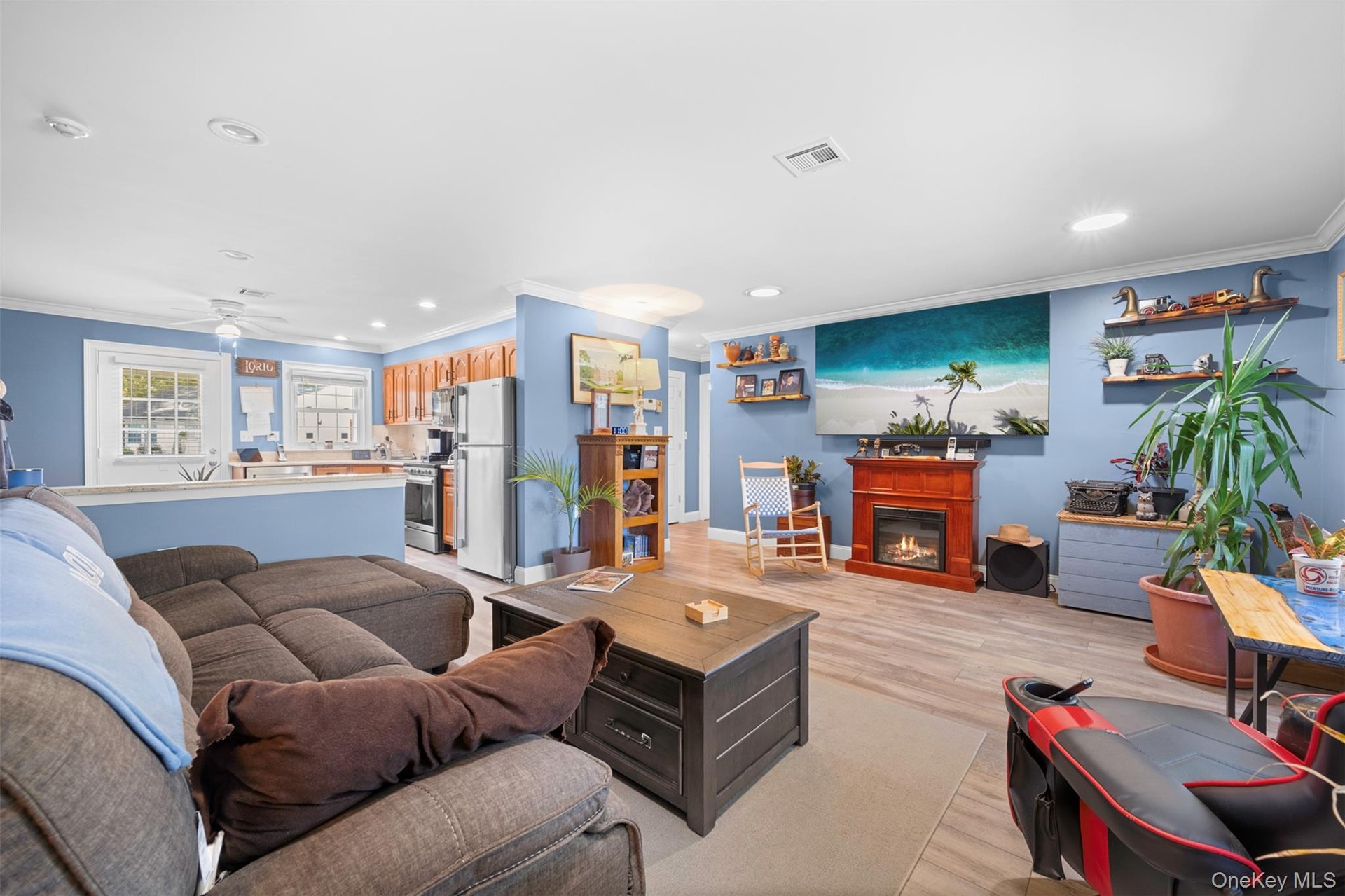 - Living room with crown molding, light wood-style flooring, and recessed lighting
