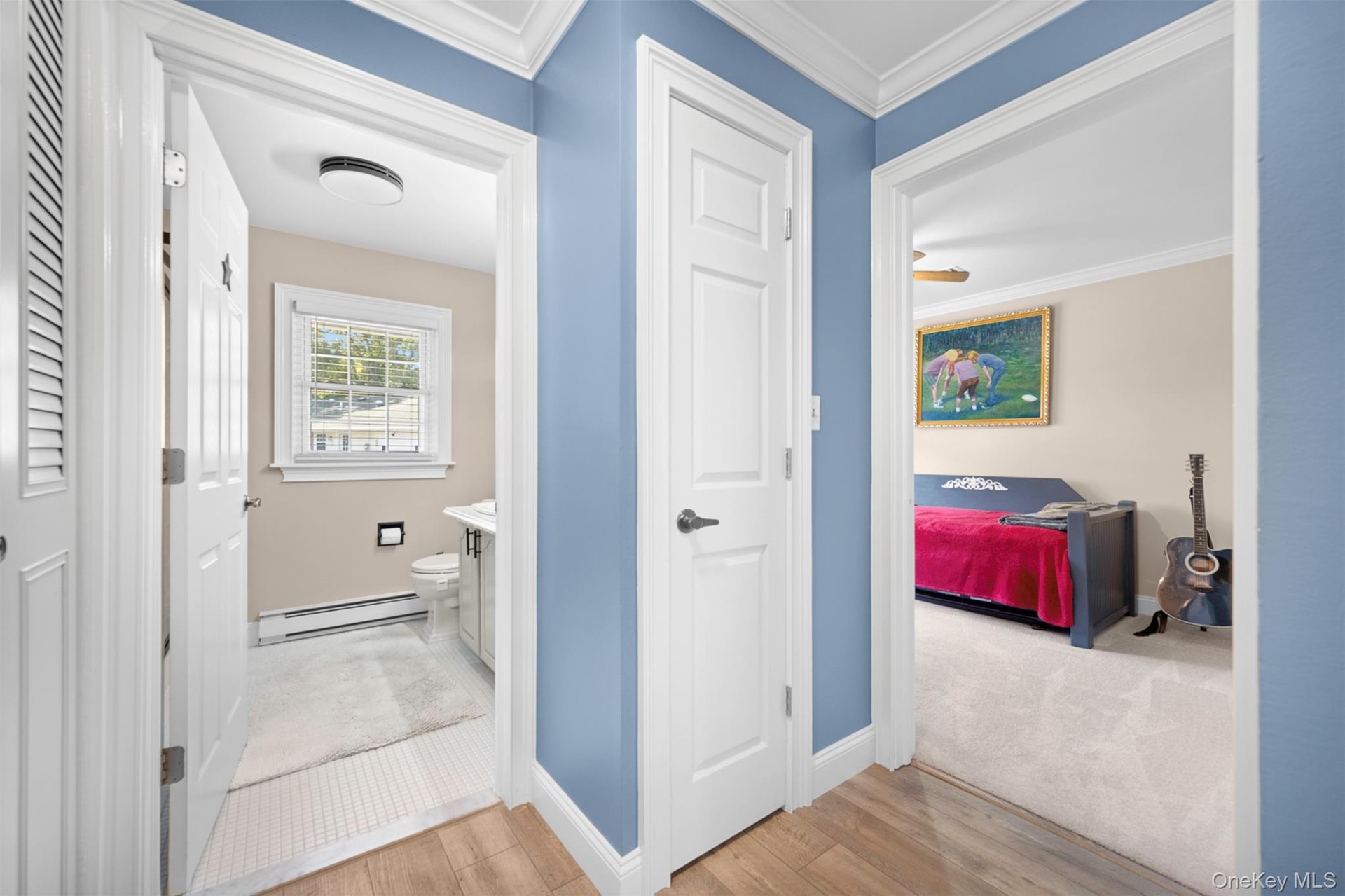 - Hallway featuring crown molding, light carpet, light wood finished floors, and a baseboard radiator