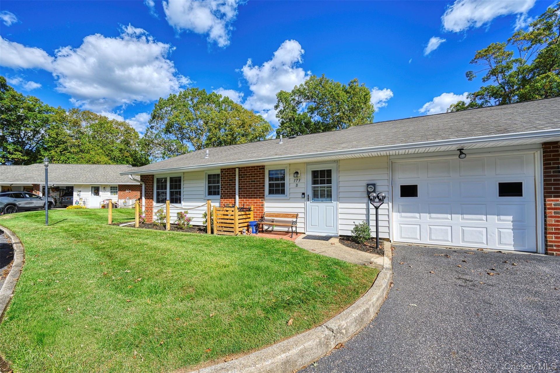 - Single story home featuring a front lawn, a garage, brick siding, and driveway