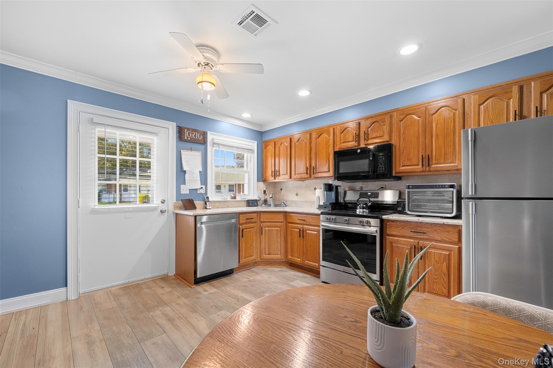 - Kitchen featuring stainless steel appliances, crown molding, light countertops, brown cabinetry, and light wood-style floors