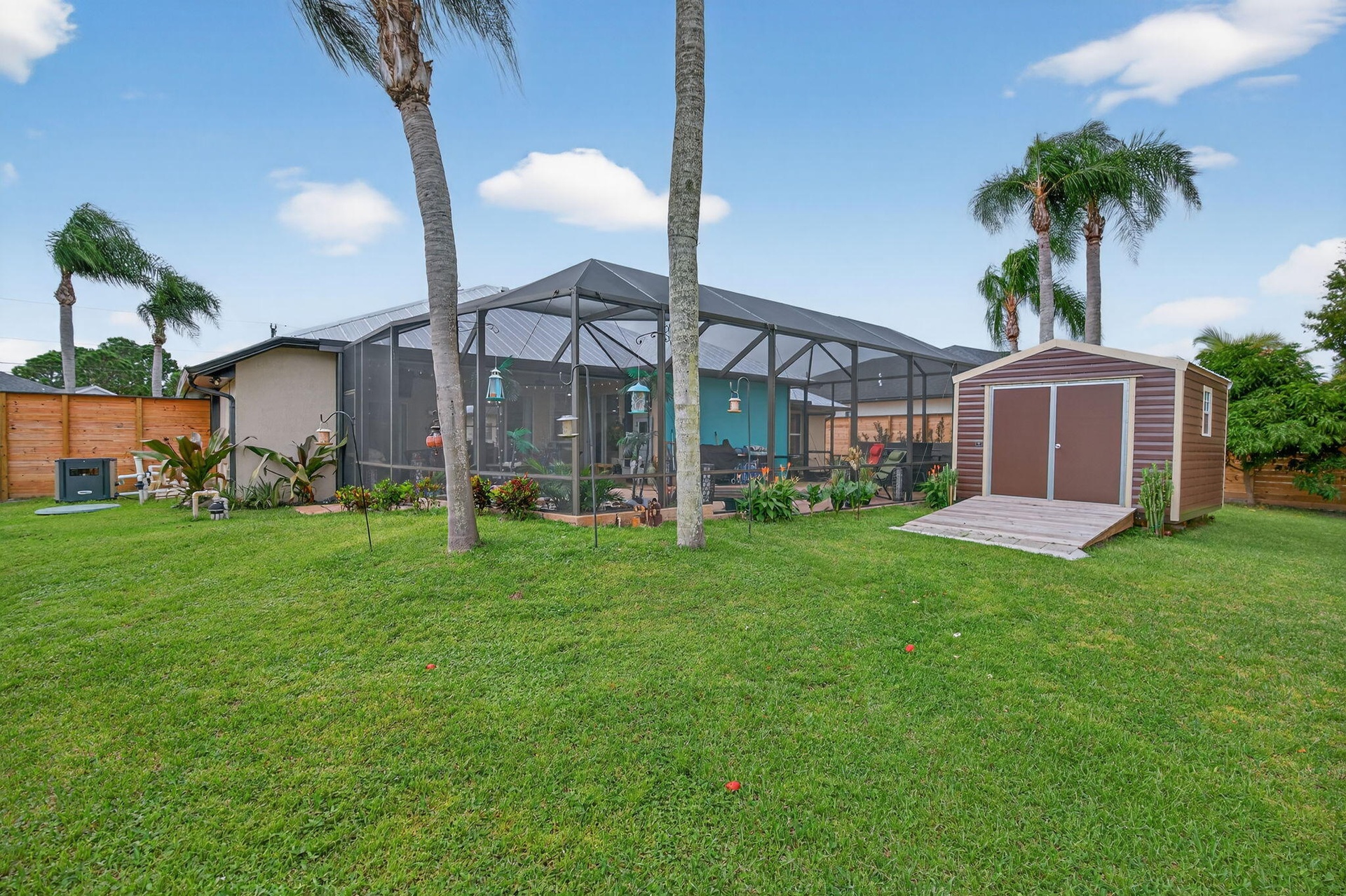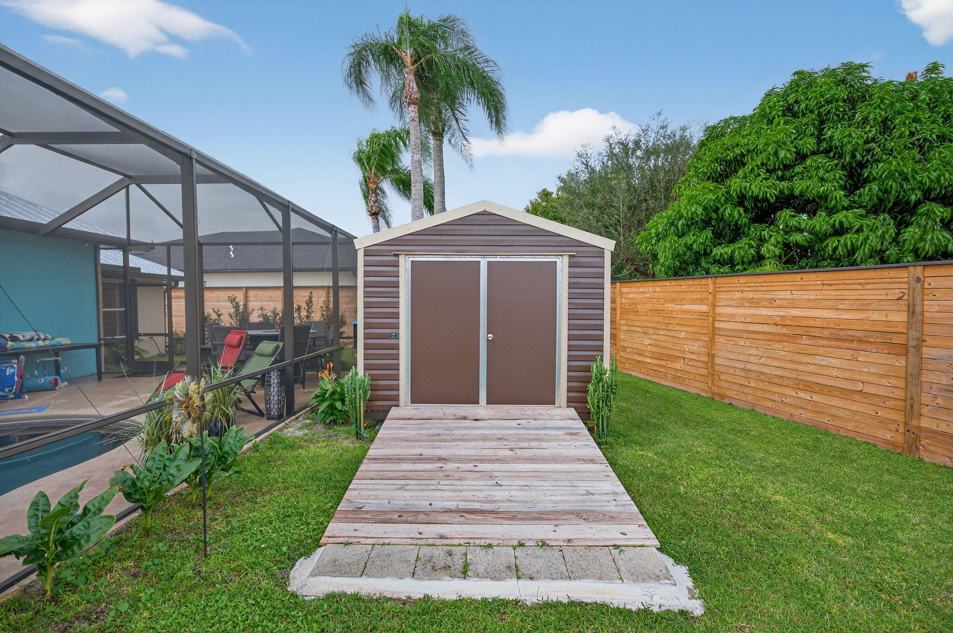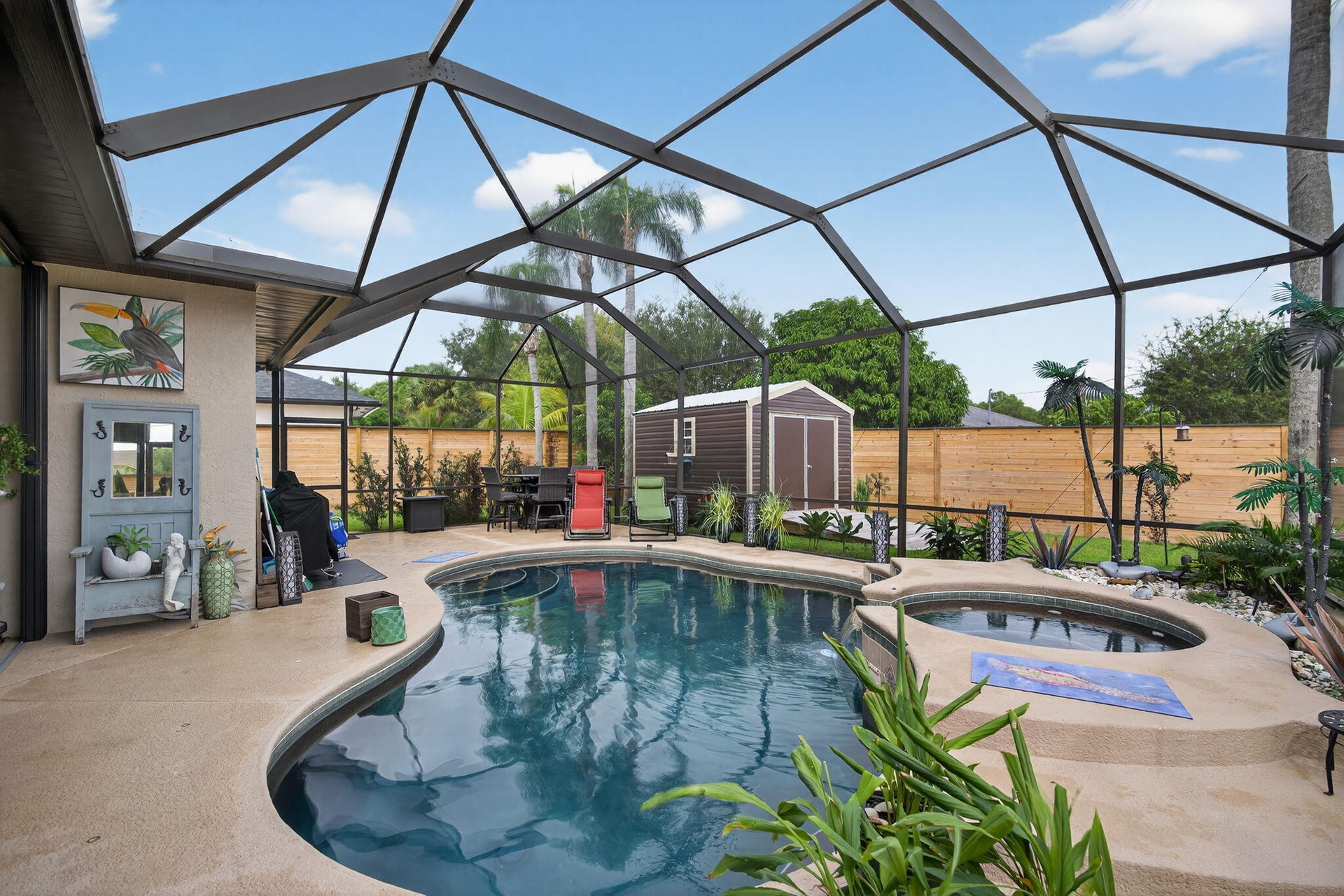 Stunning 3BR/2.5BA, 2-car garage CBS pool home with over $125K in upgrades! Featuring a 2023 metal roof and gutters, 2024 accordion shutters. Backyard offers ultimate privacy with a 2025 custom built 8' horizontal fence w/ reinforced gates. oversized corner lot, 2024 Shed with ramp wired for electrical hookup. Guinite black-bottom custom tile pool w/ spa, new 2024 pool heater & pump, and a refurbished screened pool cage. Custom-painted lanai & cabana bath w/ updated lighting & faucet. Professionally landscaped. Driveway custom painted & sealed w/ decorative border. House wired for generator hookup. Tile flooring throughout, new Samsung Bespoke appliances, 2024 interior & exterior painted. Updated lighting & fixtures. With too many upgrades to list, you have to see it to believe it!