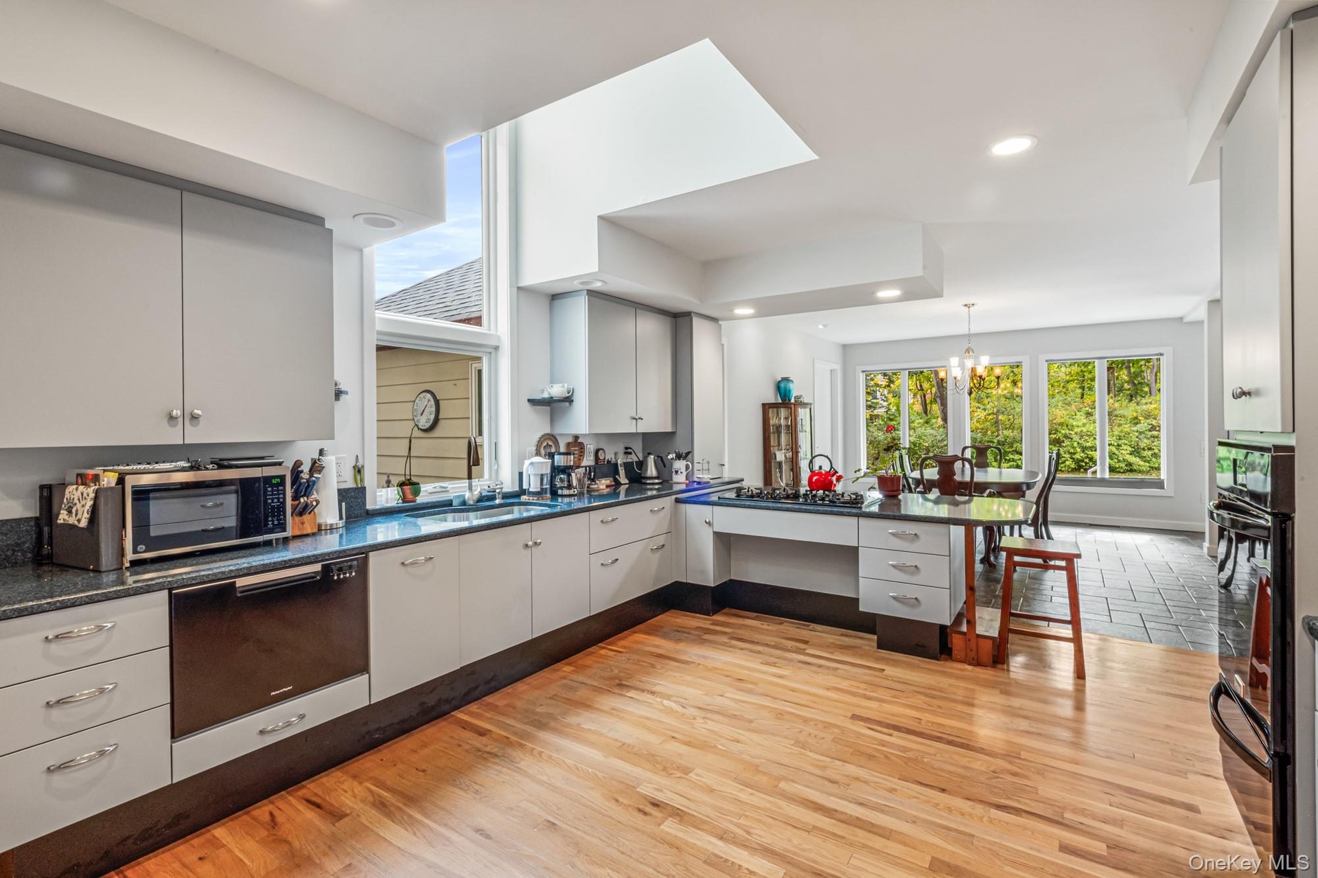 - Kitchen featuring light wood-type flooring, recessed lighting, black appliances, a warming drawer, and white cabinets