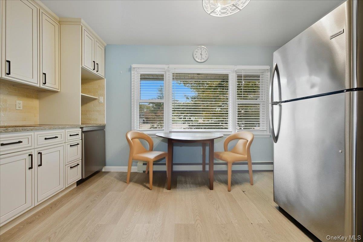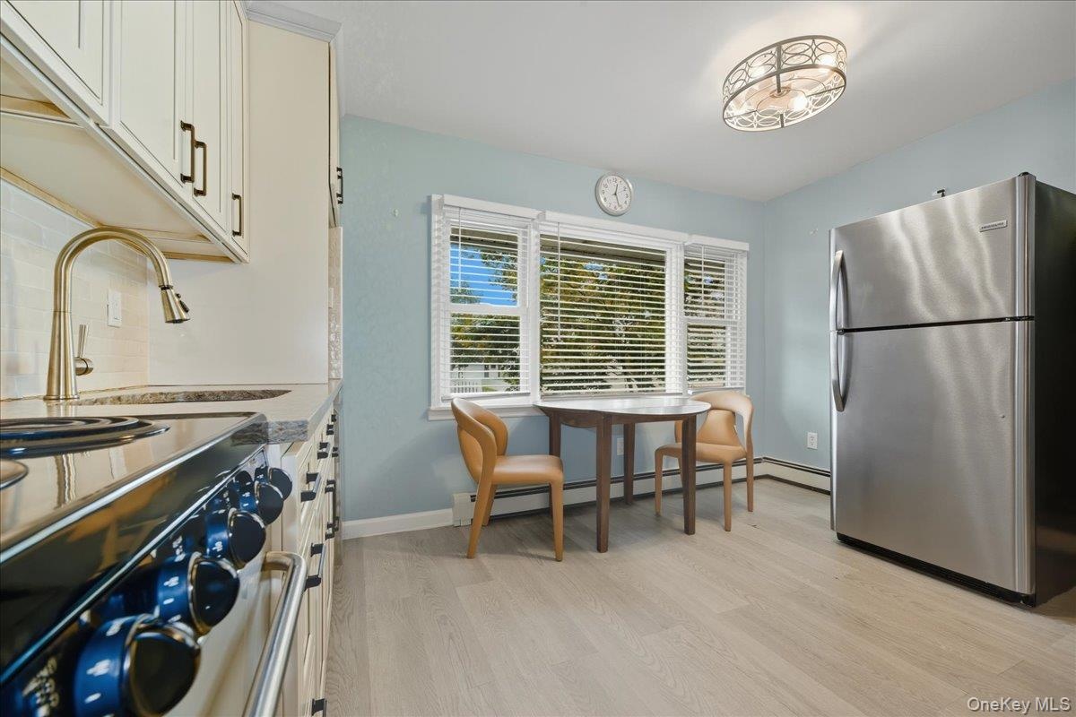 - Kitchen featuring freestanding refrigerator, stove, light wood-style floors, baseboard heating, and tasteful backsplash