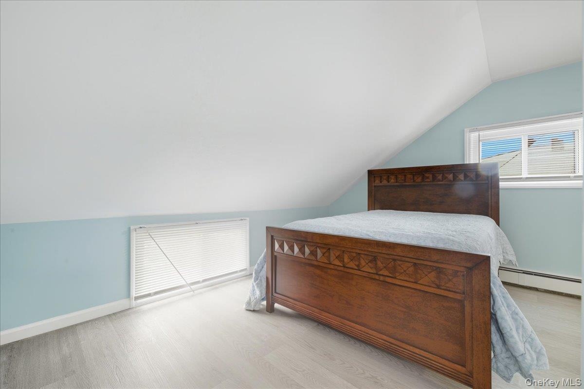 - Bedroom featuring lofted ceiling, baseboard heating, and wood finished floors