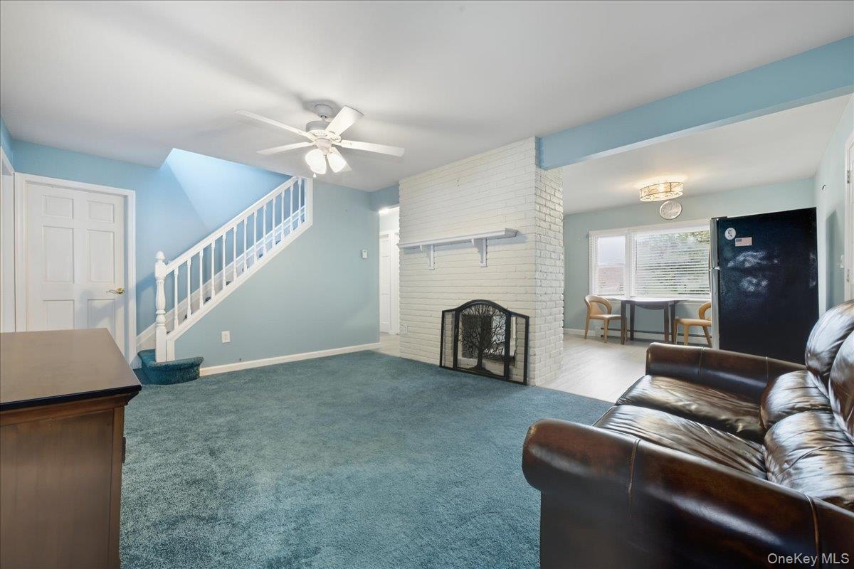 - Carpeted living room featuring a brick fireplace, stairs, and ceiling fan