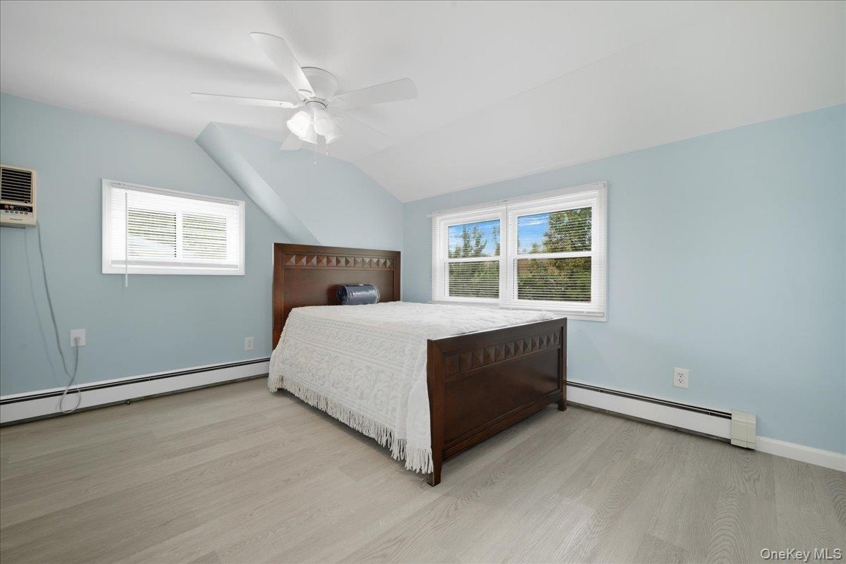 - Bedroom with a baseboard radiator, vaulted ceiling, light wood finished floors, and a ceiling fan