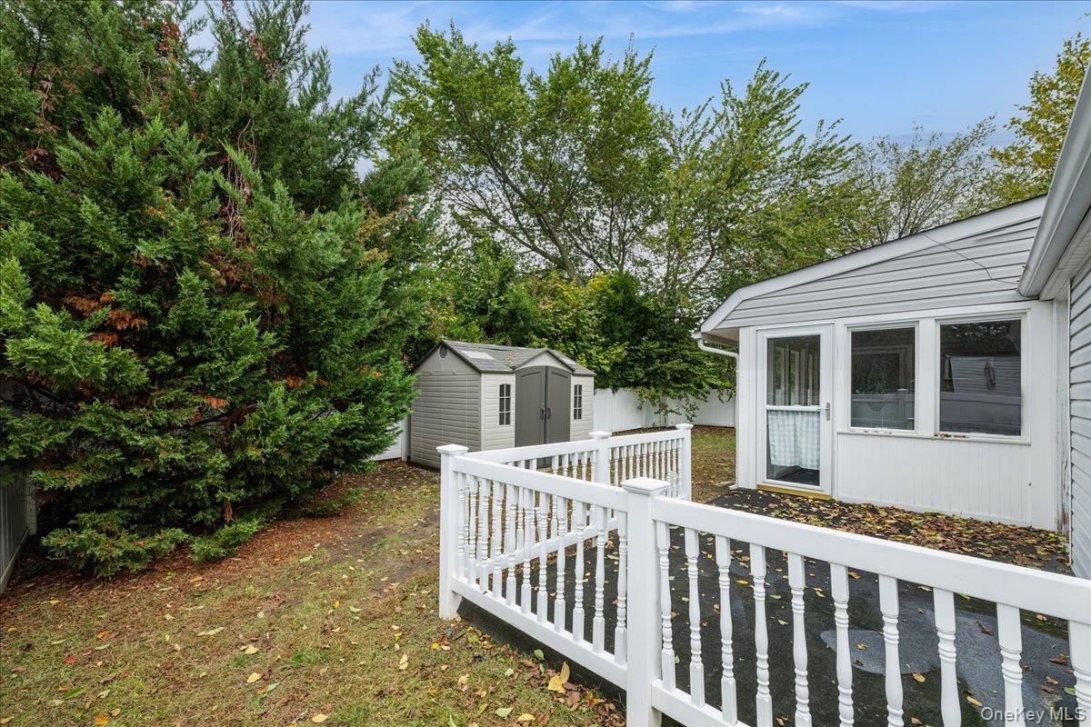 - View of yard featuring a shed, view of scattered trees, and a wooden deck