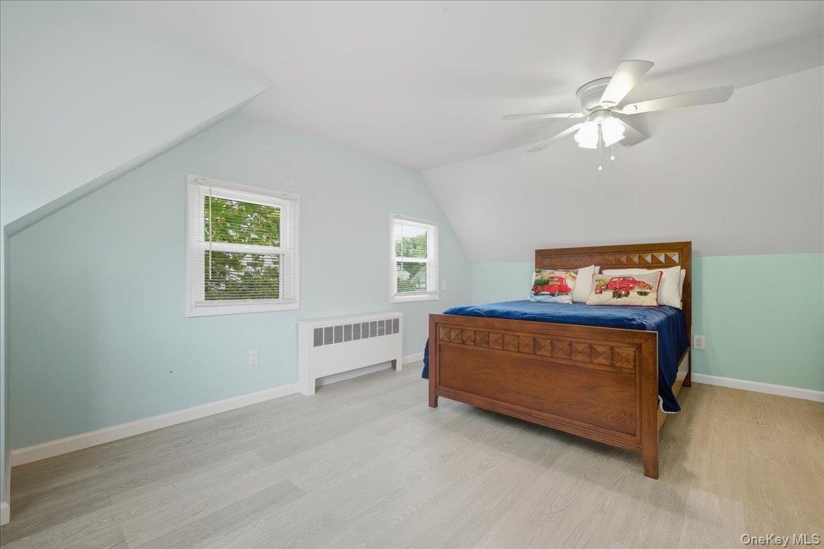 - Bedroom featuring radiator, vaulted ceiling, light wood-style flooring, and ceiling fan