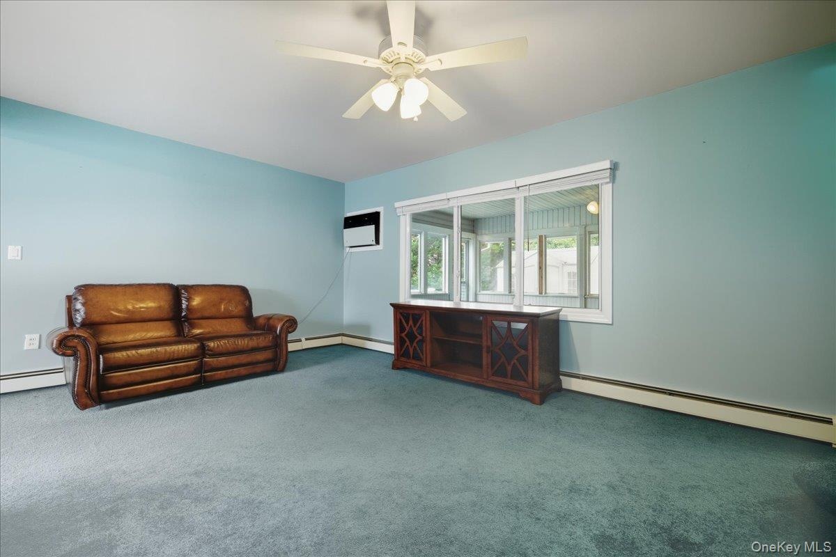 - Living area with carpet floors, a baseboard heating unit, an AC wall unit, and ceiling fan