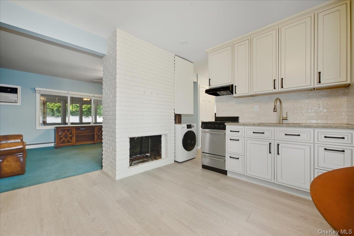 - Kitchen featuring tasteful backsplash, washer / clothes dryer, light stone countertops, stainless steel electric range, and a fireplace