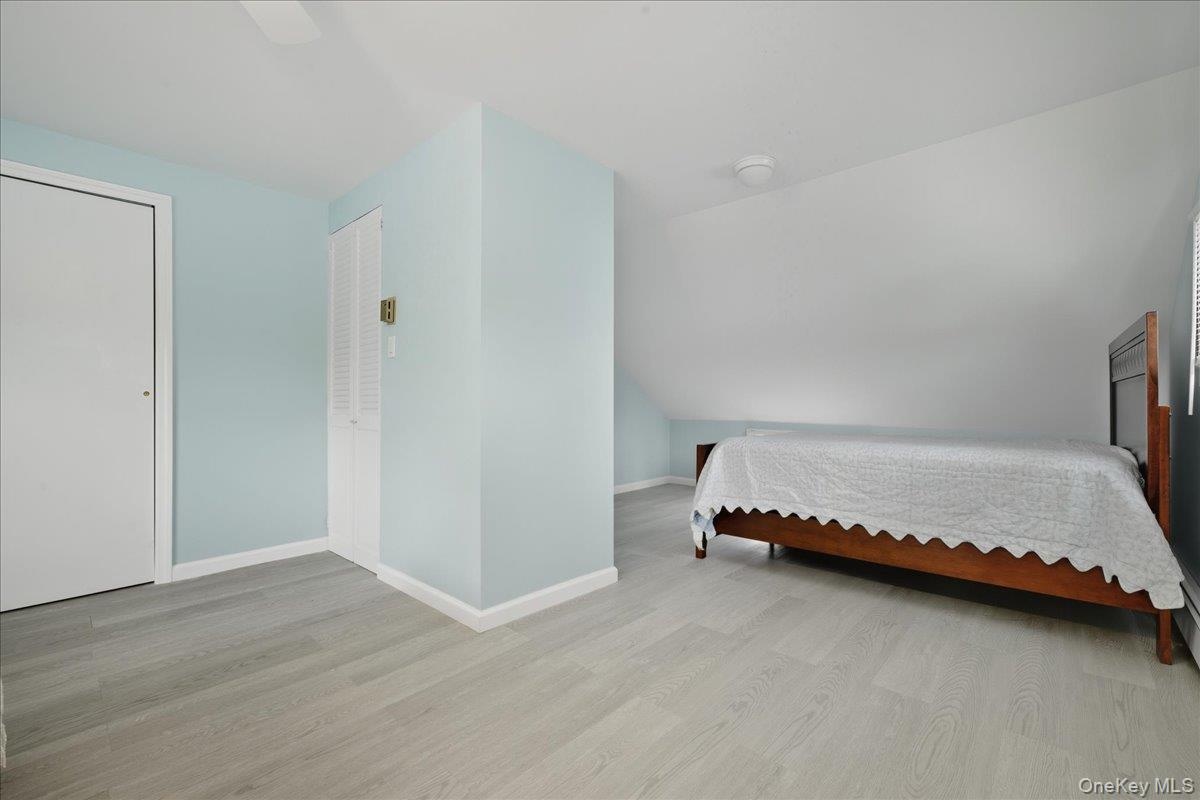- Bedroom with light wood-style flooring, ceiling fan, lofted ceiling, and a closet