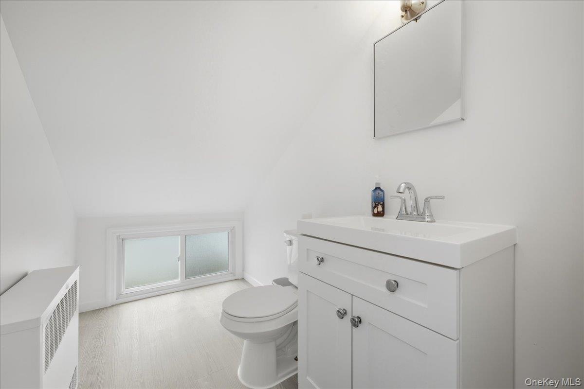 - Bathroom with radiator heating unit, vanity, lofted ceiling, and light wood-style floors