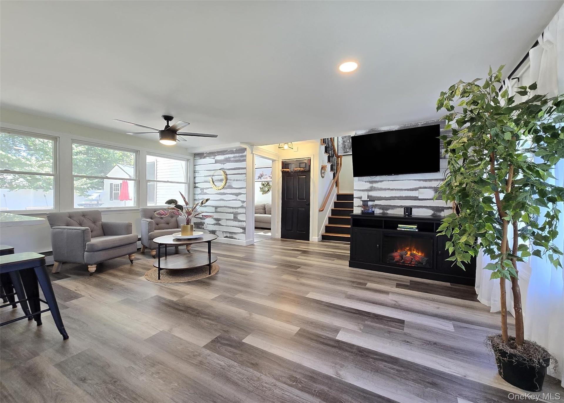 - Living area featuring wood finished floors, stairs, recessed lighting, a ceiling fan, and a warm lit fireplace