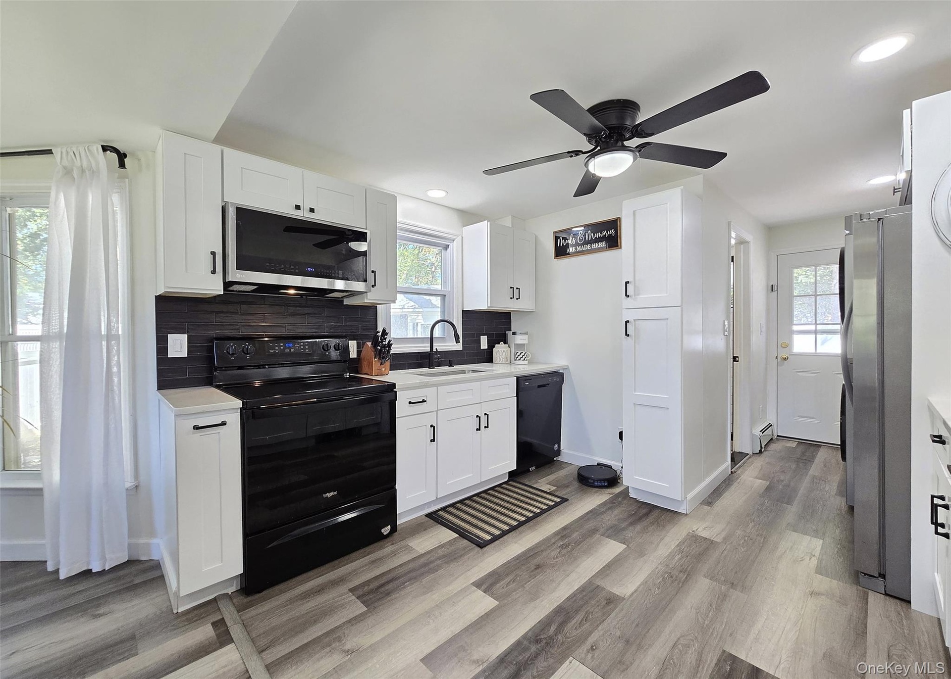 - Kitchen featuring tasteful backsplash, black appliances, light countertops, white cabinetry, and recessed lighting