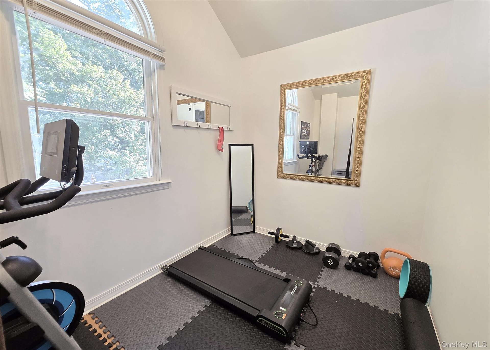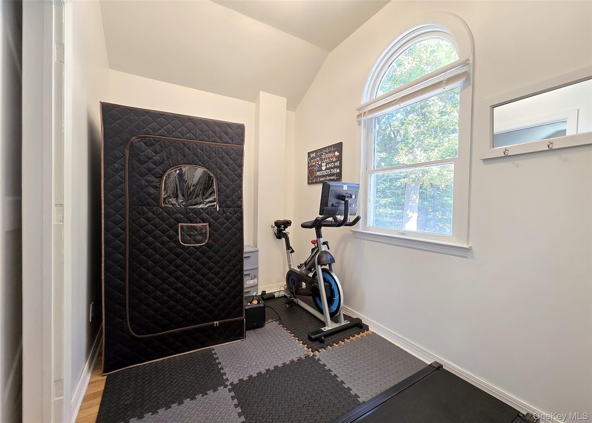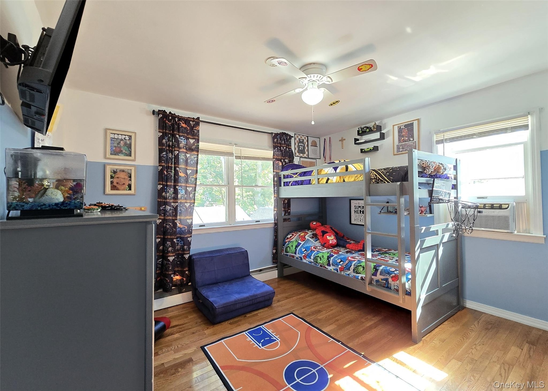 - Bedroom featuring multiple windows, vaulted ceiling, light wood-style flooring, a ceiling fan, and baseboard heating