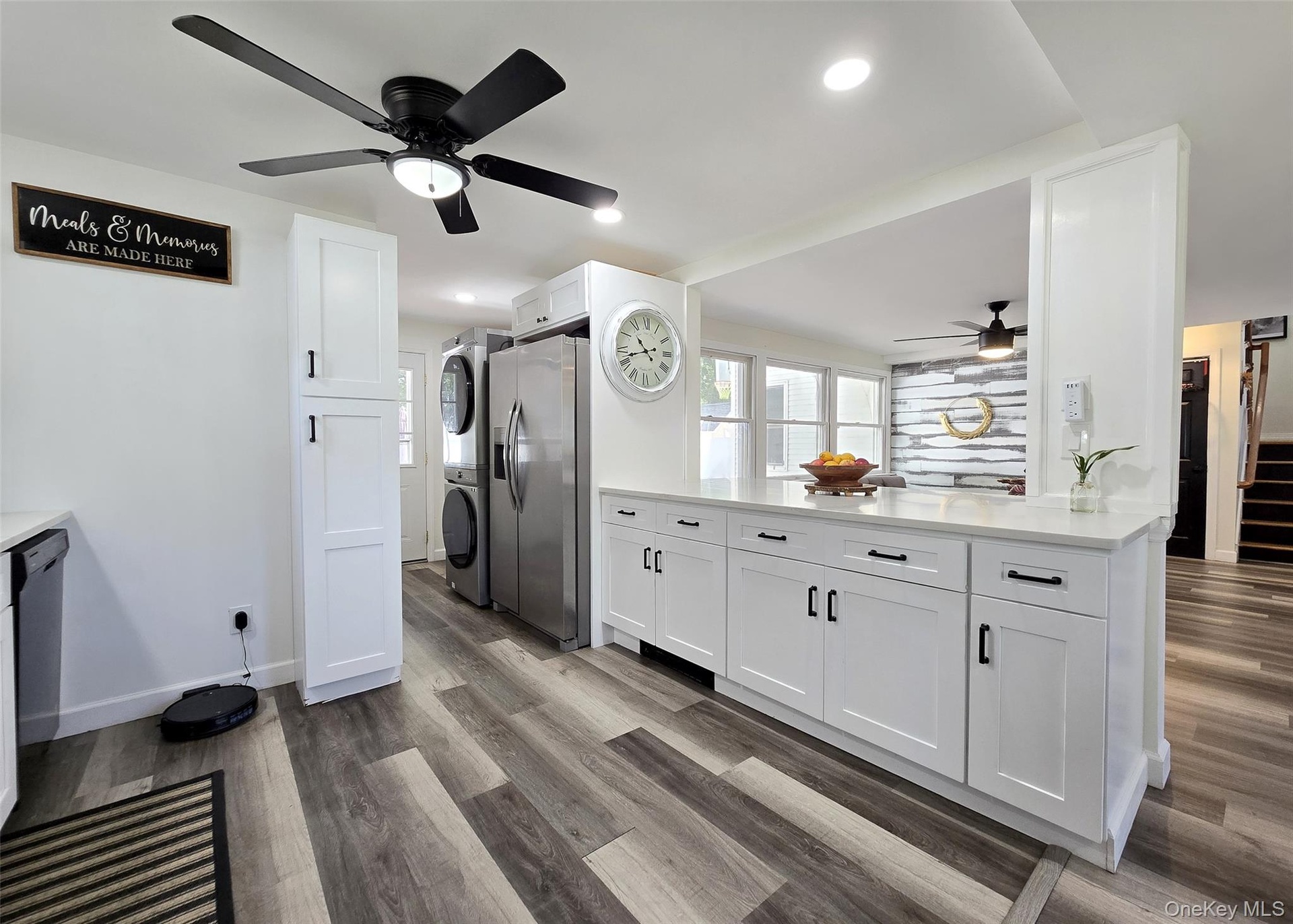 - Kitchen featuring white cabinetry, appliances with stainless steel finishes, ceiling fan, dark wood-type flooring, and stacked washer and clothes drye
