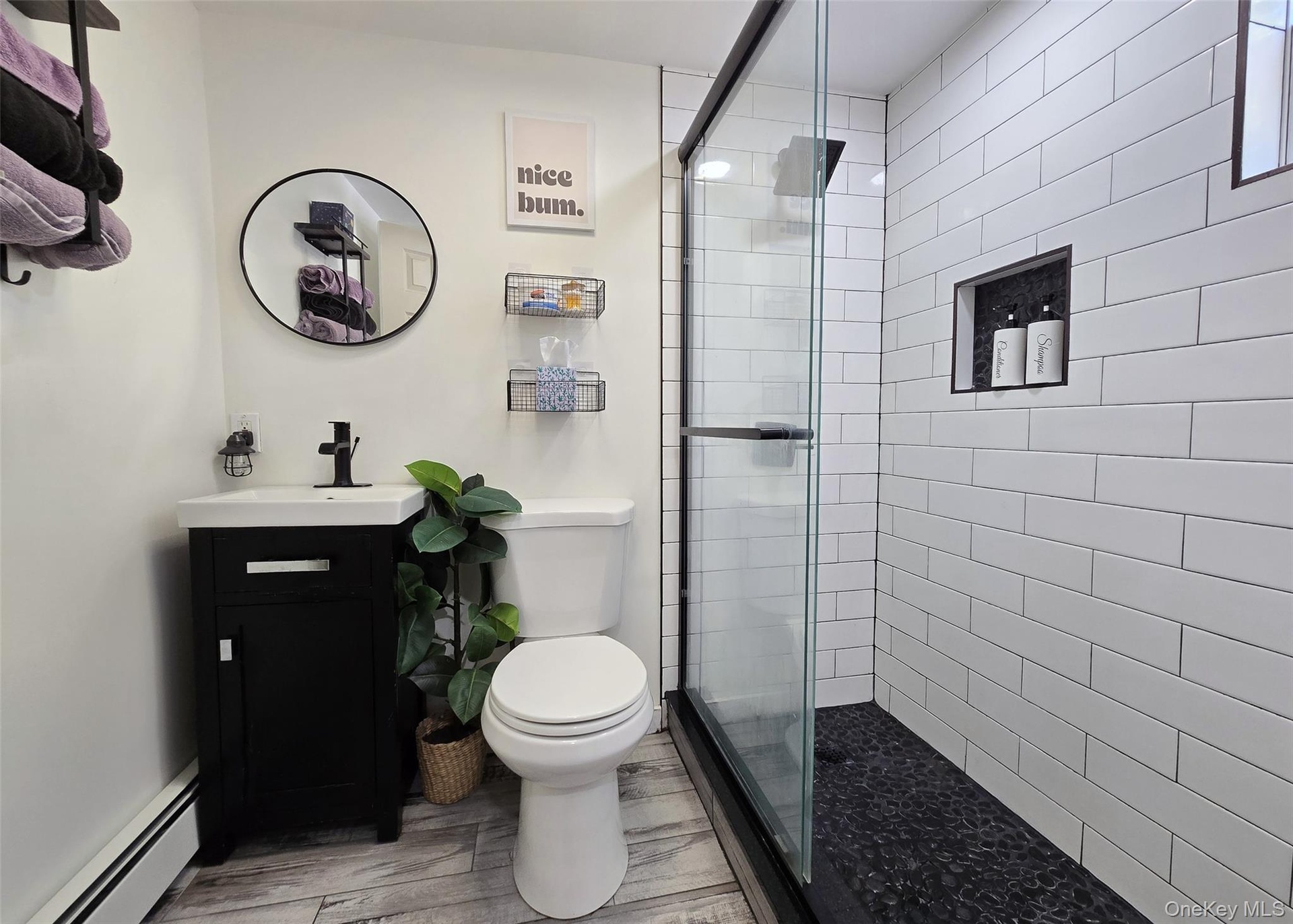 - Bathroom featuring a baseboard heating unit, a shower stall, vanity, and wood tiled floors