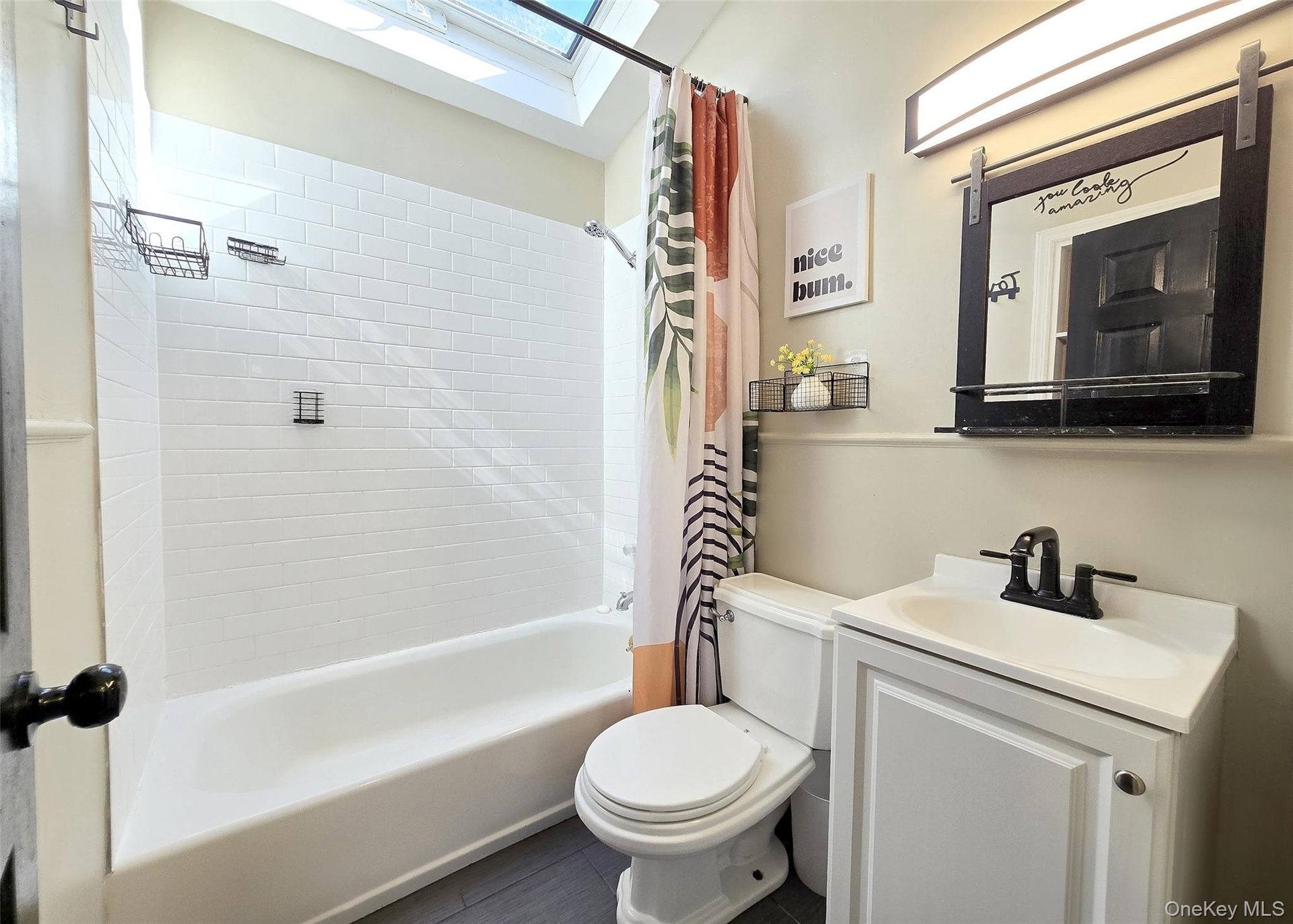 - Full bathroom featuring a skylight, shower / bathtub combination with curtain, and vanity