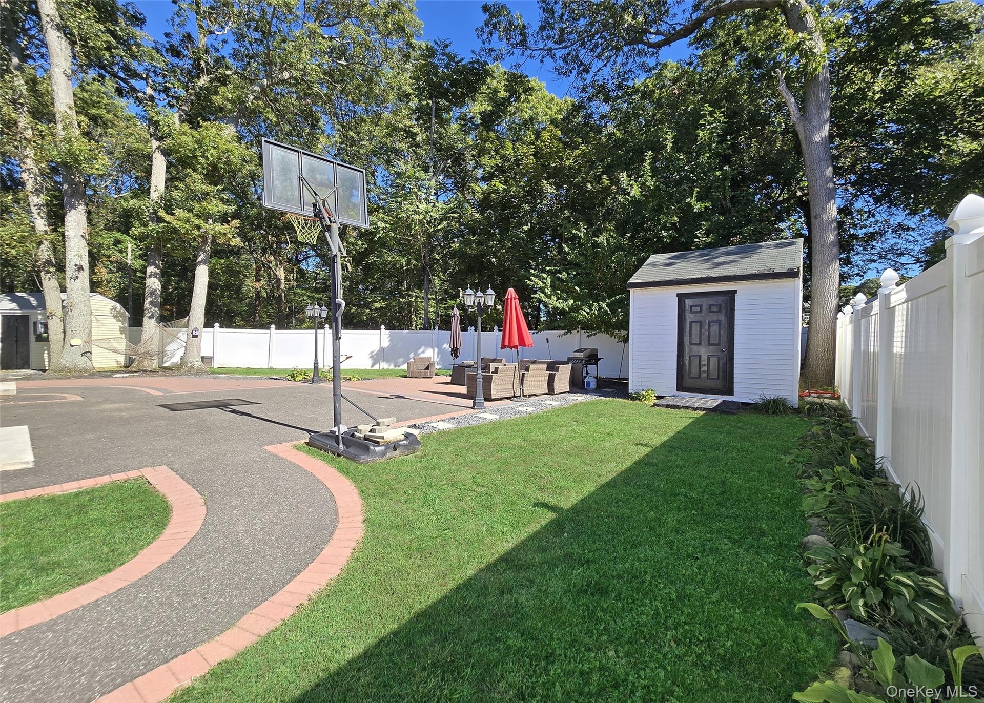 - Fenced backyard featuring a storage shed and an outdoor living space
