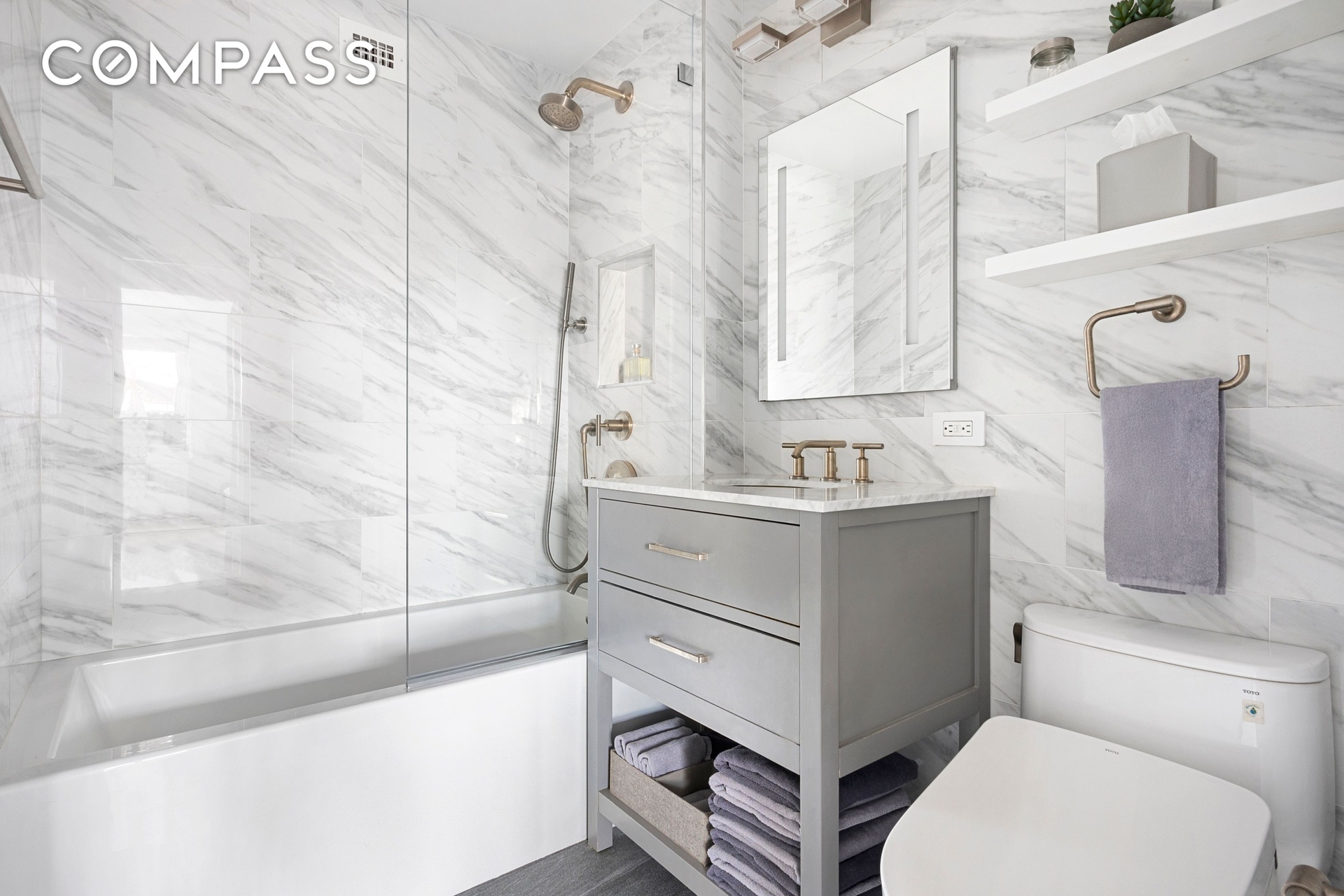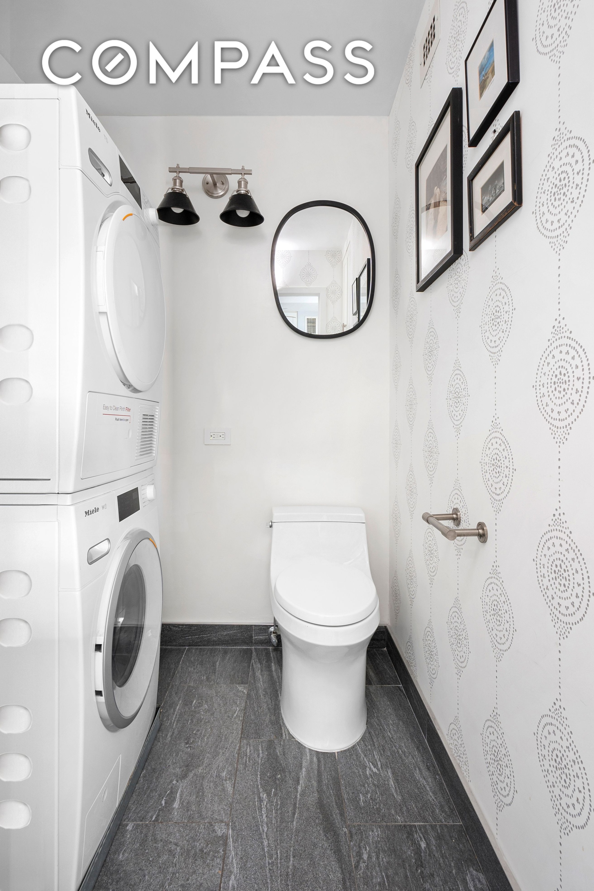 The ceramic bathroom offers a spa-like experience with a soaking tub, radiant heated floors, TOTO washlet, Robern lighted medicine cabinet and modern fixtures. The powder room also conveniently houses the Miele Washer/Dryer and plenty of added storage for your laundry supplies.