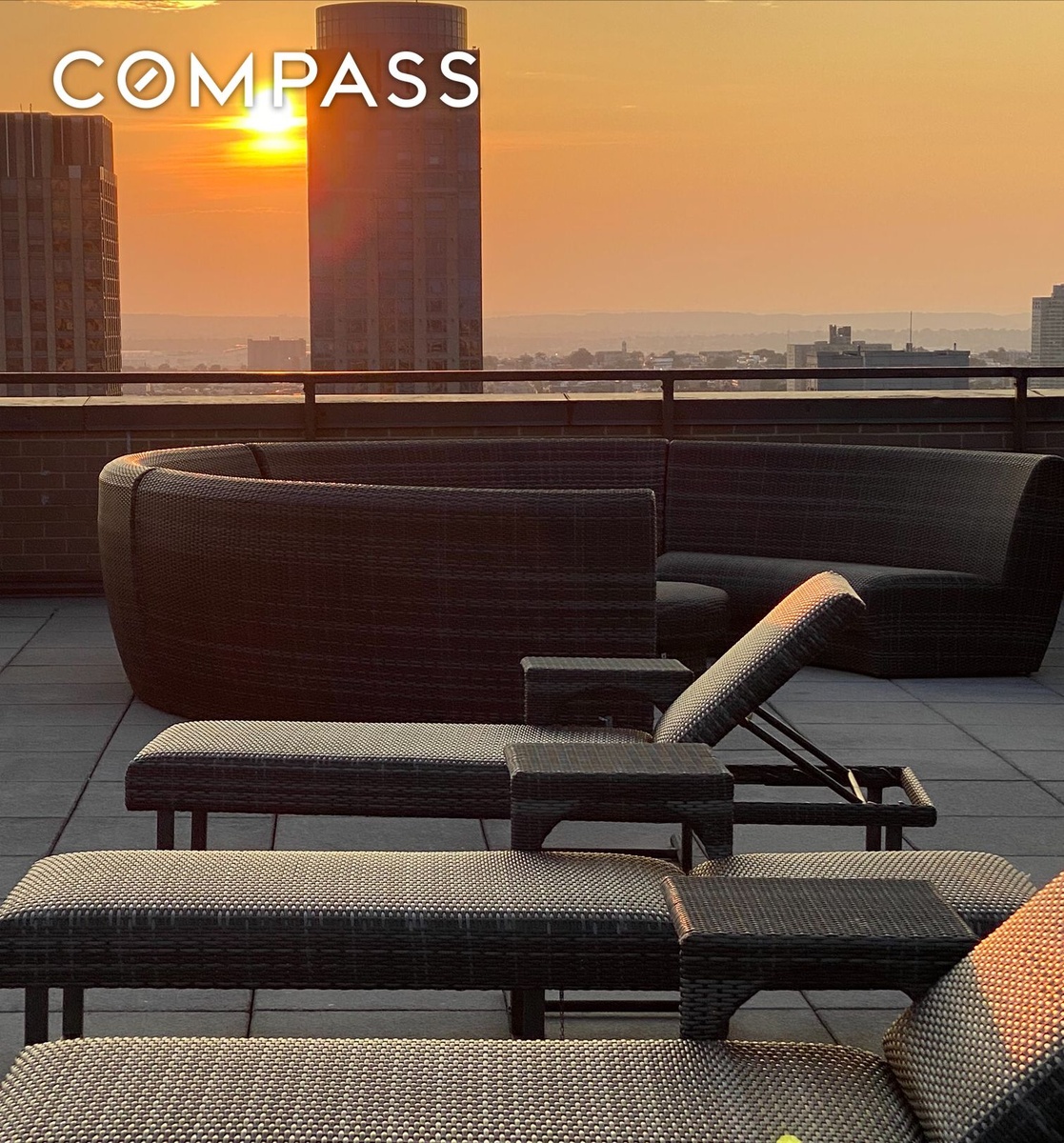 Step inside this glorious residence to discover a beautiful open kitchen, featuring quartz counters, stainless steel appliances, ombre backsplash, a breakfast bar, and a wine cooler. Entertain from your private balcony with striking northeastern and western views. This corner unit is sunny all day long, enjoy beautiful western sunsets and the moon over NYC.