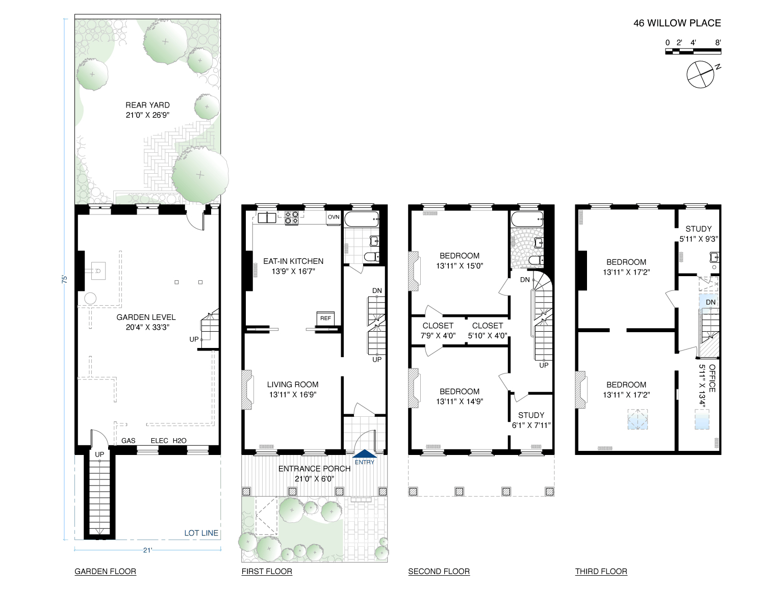 The parlor floor is graced with ceilings ten feet high and comprises a front parlor, a large eat-in kitchen, and a full windowed bath. Upstairs there are four large bedrooms, three multi-purpose side rooms, two walk-in closets, and another full windowed bath. The garden level, which is hidden from the street, has a stairwell that leads discreetly up to the front yard. In the back, the garden level steps out on the same level as the backyard, which allows for an array of architectural design options. You’ll find that the spacious backyard, which is currently festooned with ivy, gets great light. It is a perfect place to put your green thumb to good use or simply to relax, entertain and enjoy everyday life.