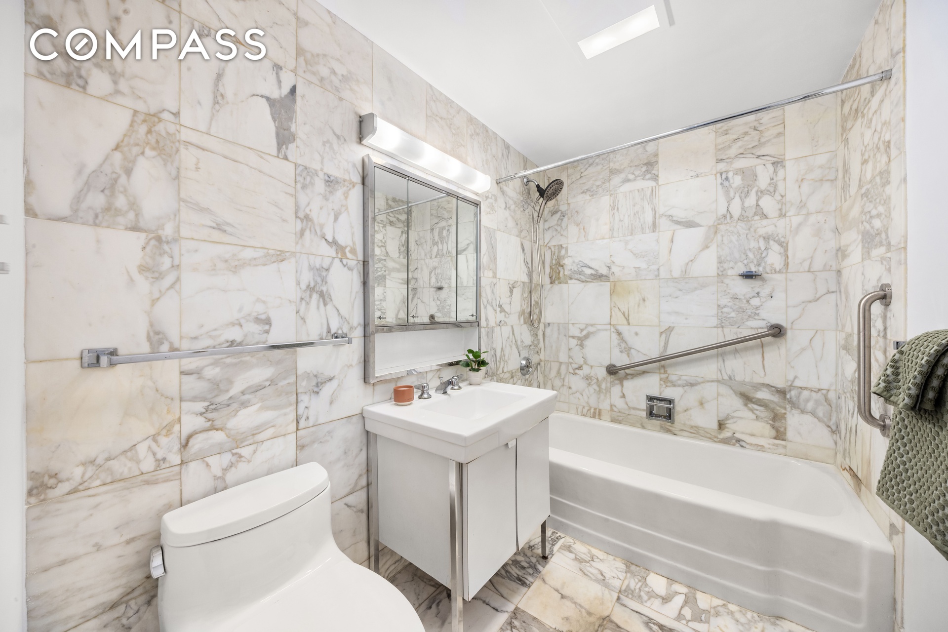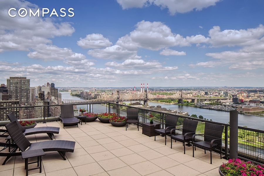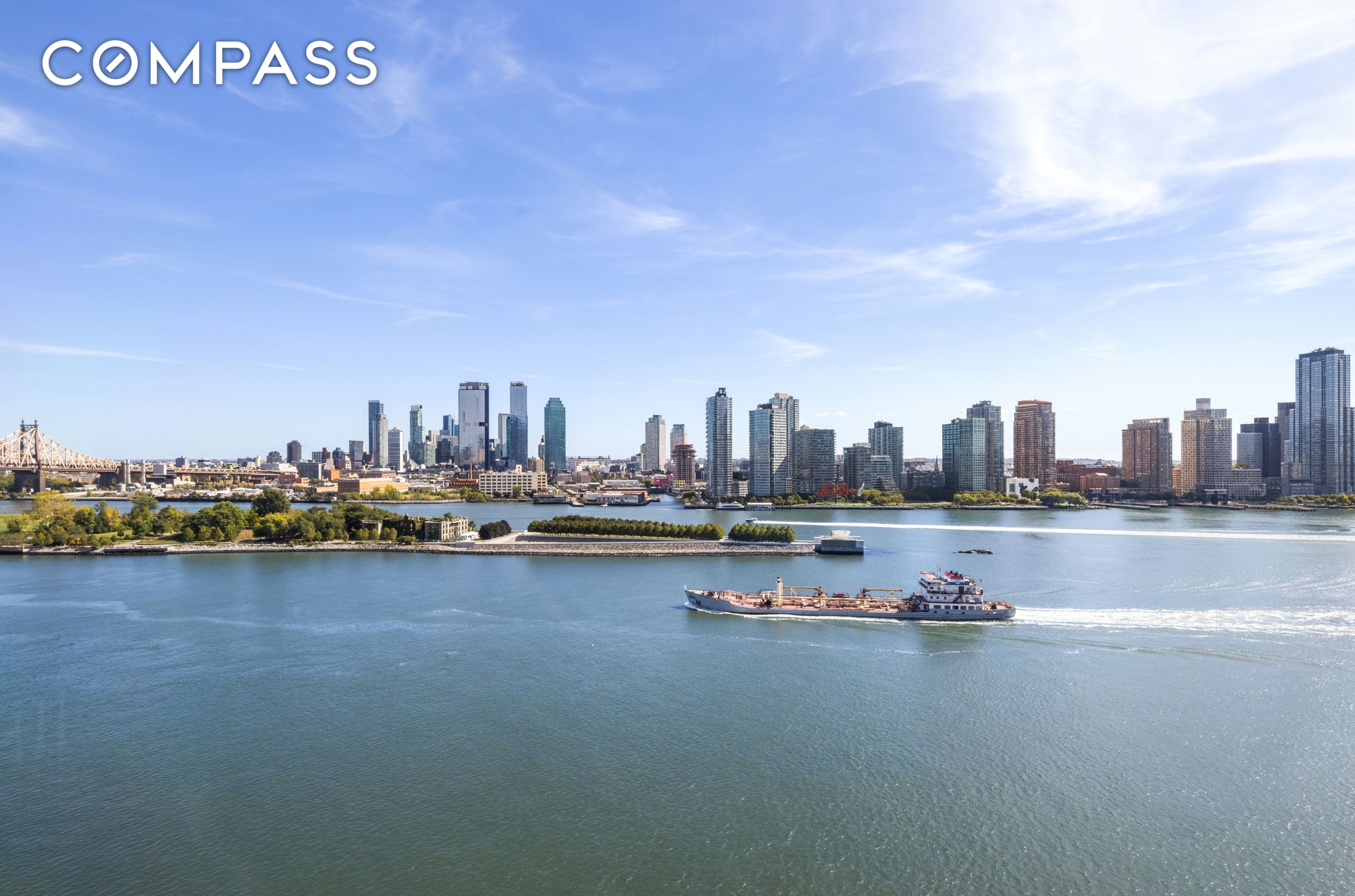 Bedrooms are thoughtfully separated from the living areas for maximum privacy. The primary bedroom overlooks the lush grounds of the United Nations and the East River, featuring an en-suite bathroom and three closets, including a generous walk-in. The second bedroom also enjoys breathtaking south-facing views and has a full bathroom just across the hall. An additional full bath near the entry doubles as a convenient powder room for guests.