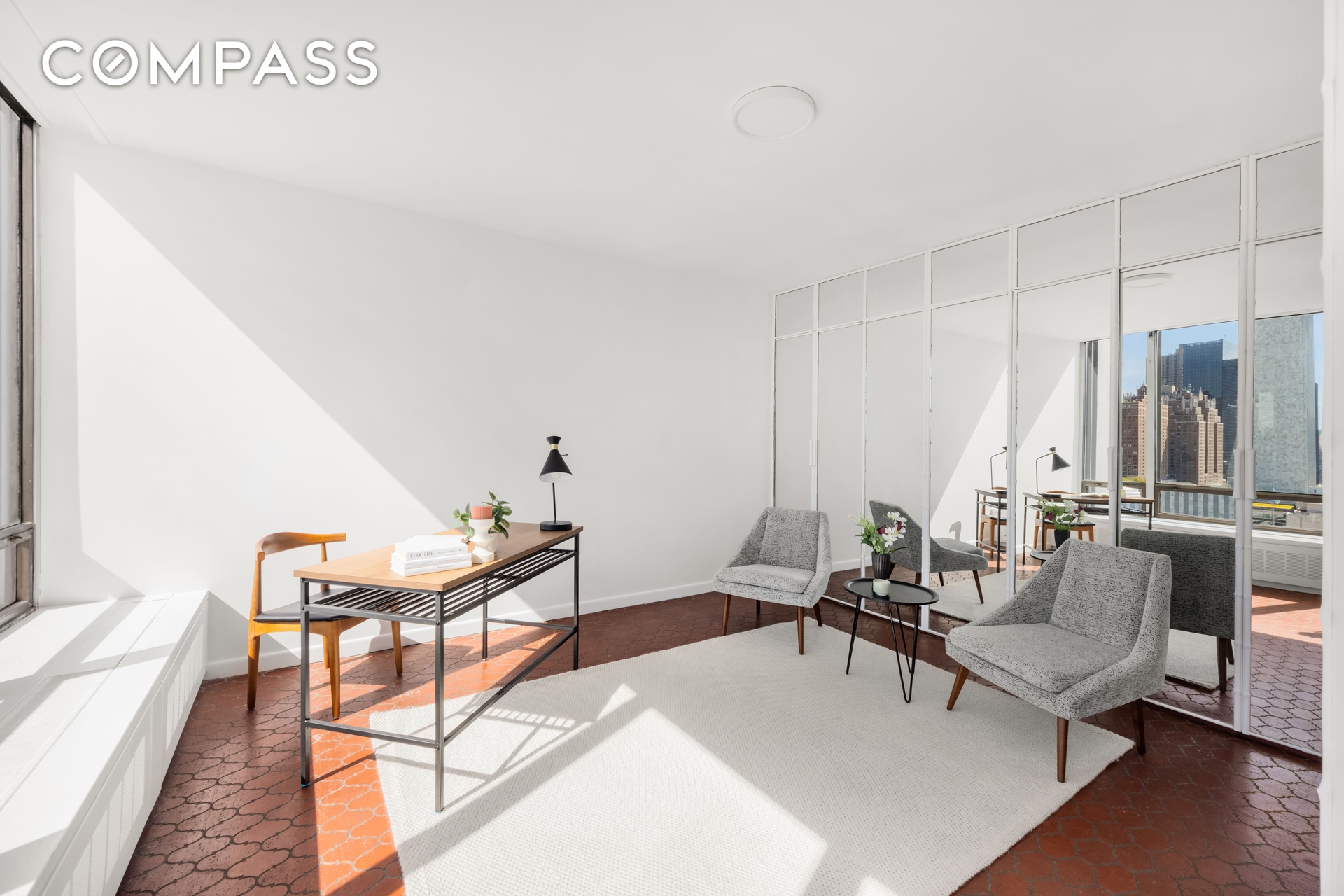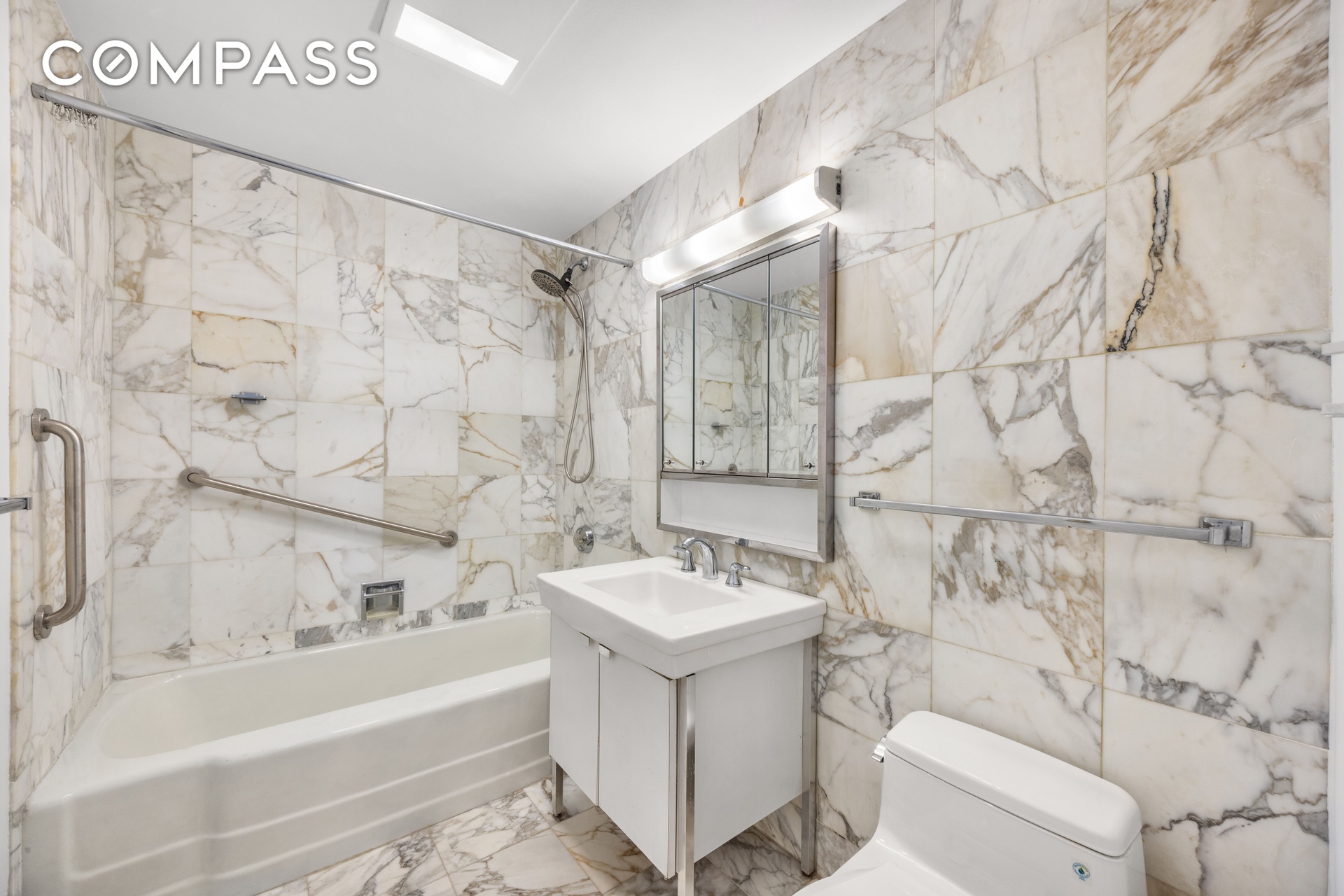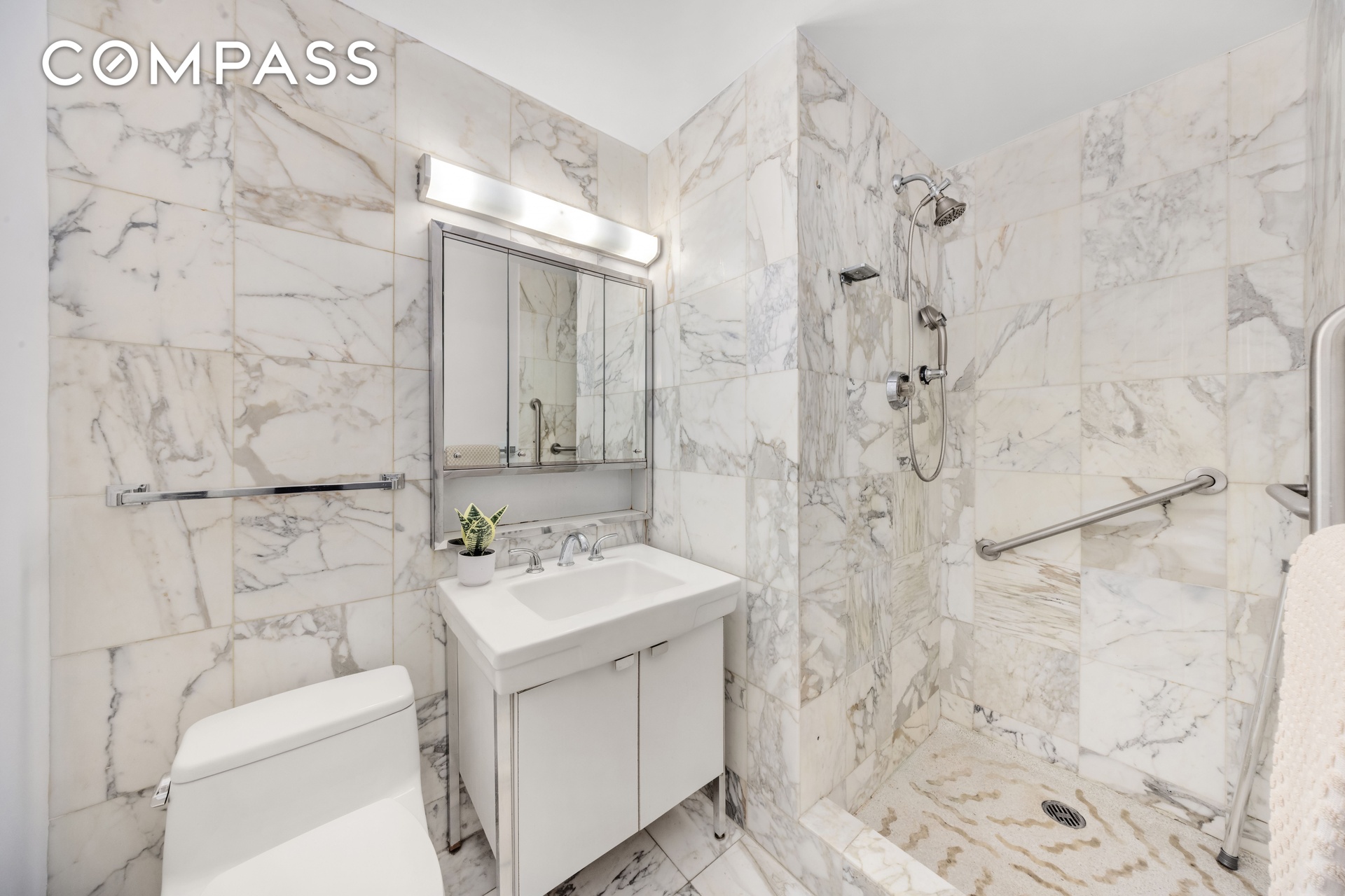 Bedrooms are thoughtfully separated from the living areas for maximum privacy. The primary bedroom overlooks the lush grounds of the United Nations and the East River, featuring an en-suite bathroom and three closets, including a generous walk-in. The second bedroom also enjoys breathtaking south-facing views and has a full bathroom just across the hall. An additional full bath near the entry doubles as a convenient powder room for guests.
