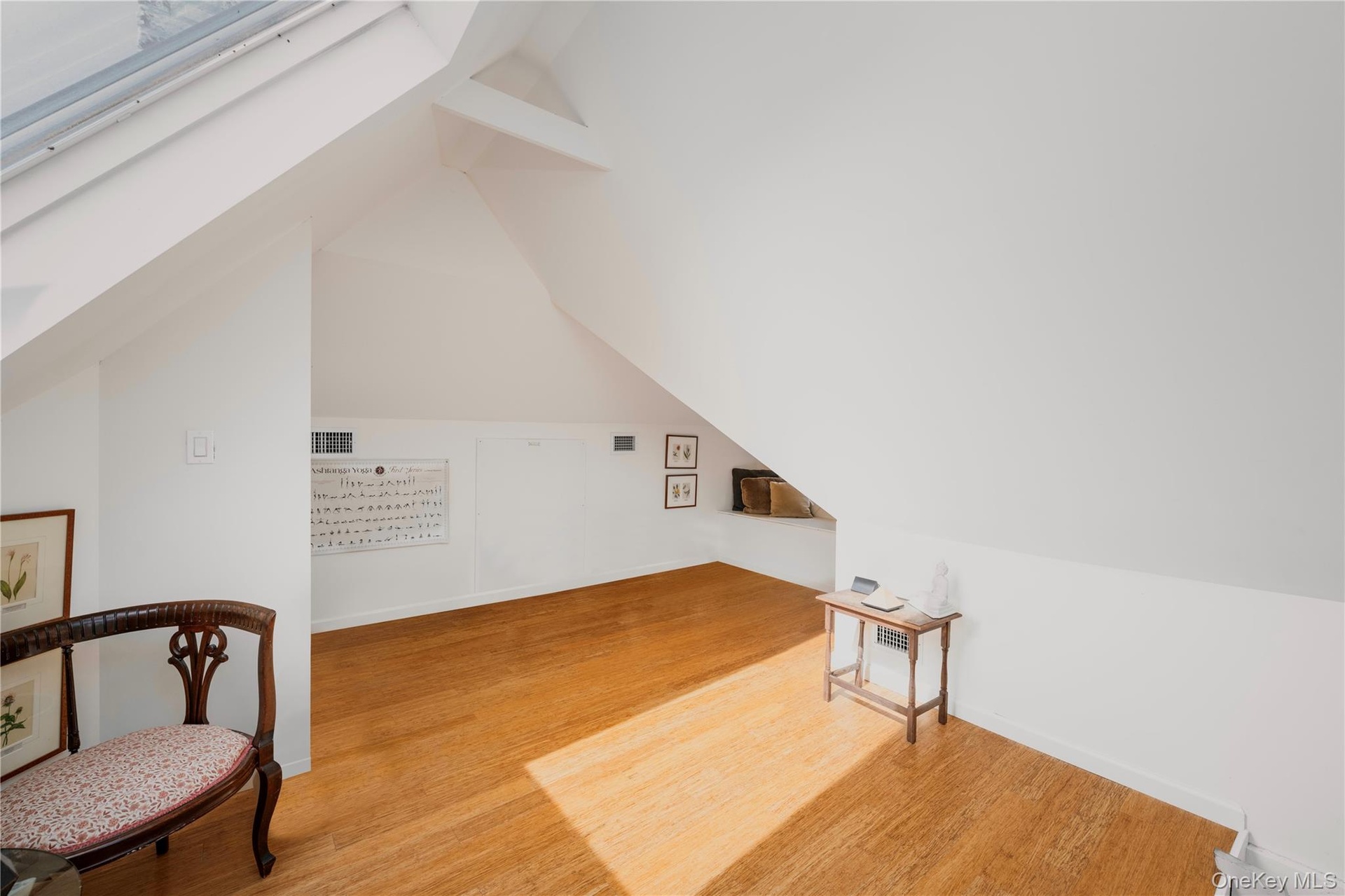- Attic/loft space with hardwood floors, skylights and stained glass gable window