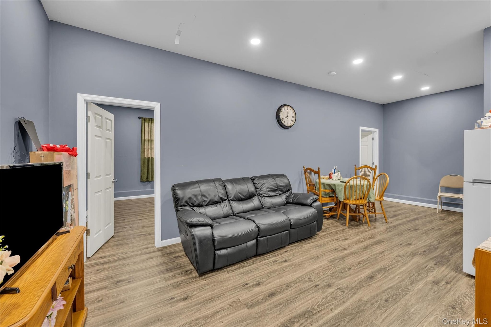 - Living area featuring light wood-style flooring and recessed lighting
