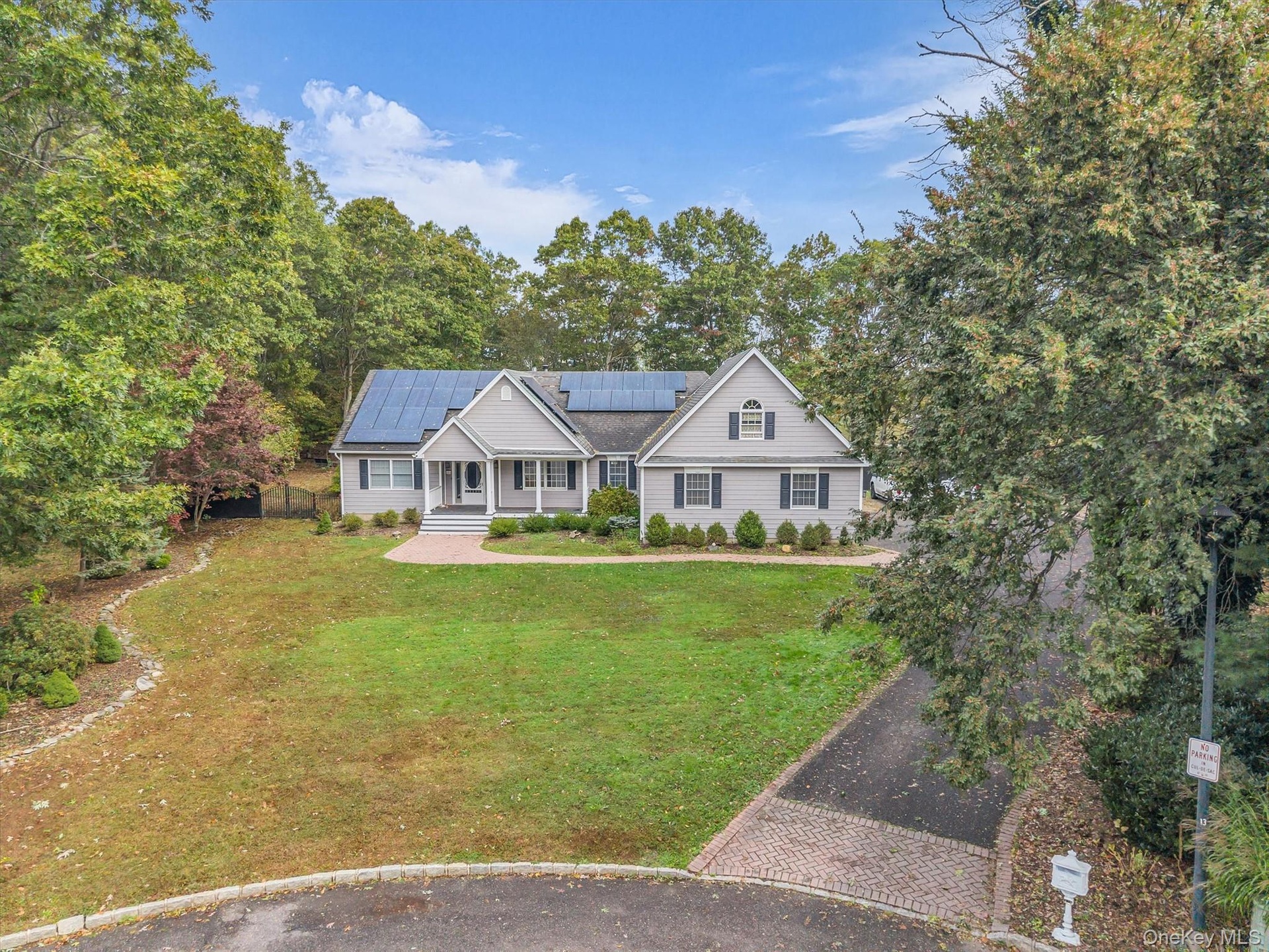 - Traditional-style house with a front lawn, solar panels, and view of wooded area