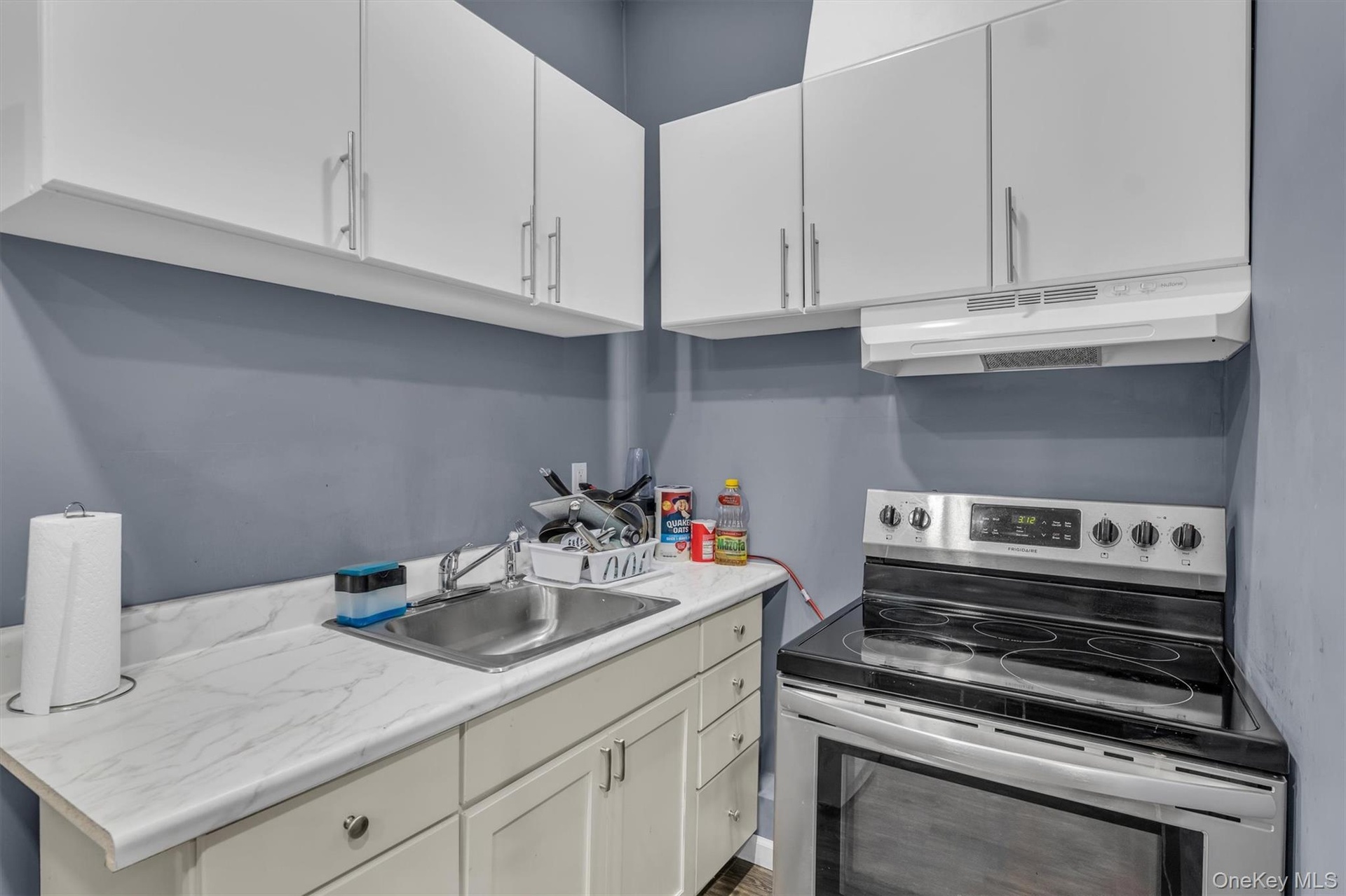 - Kitchen featuring electric stove, light countertops, under cabinet range hood, and white cabinets
