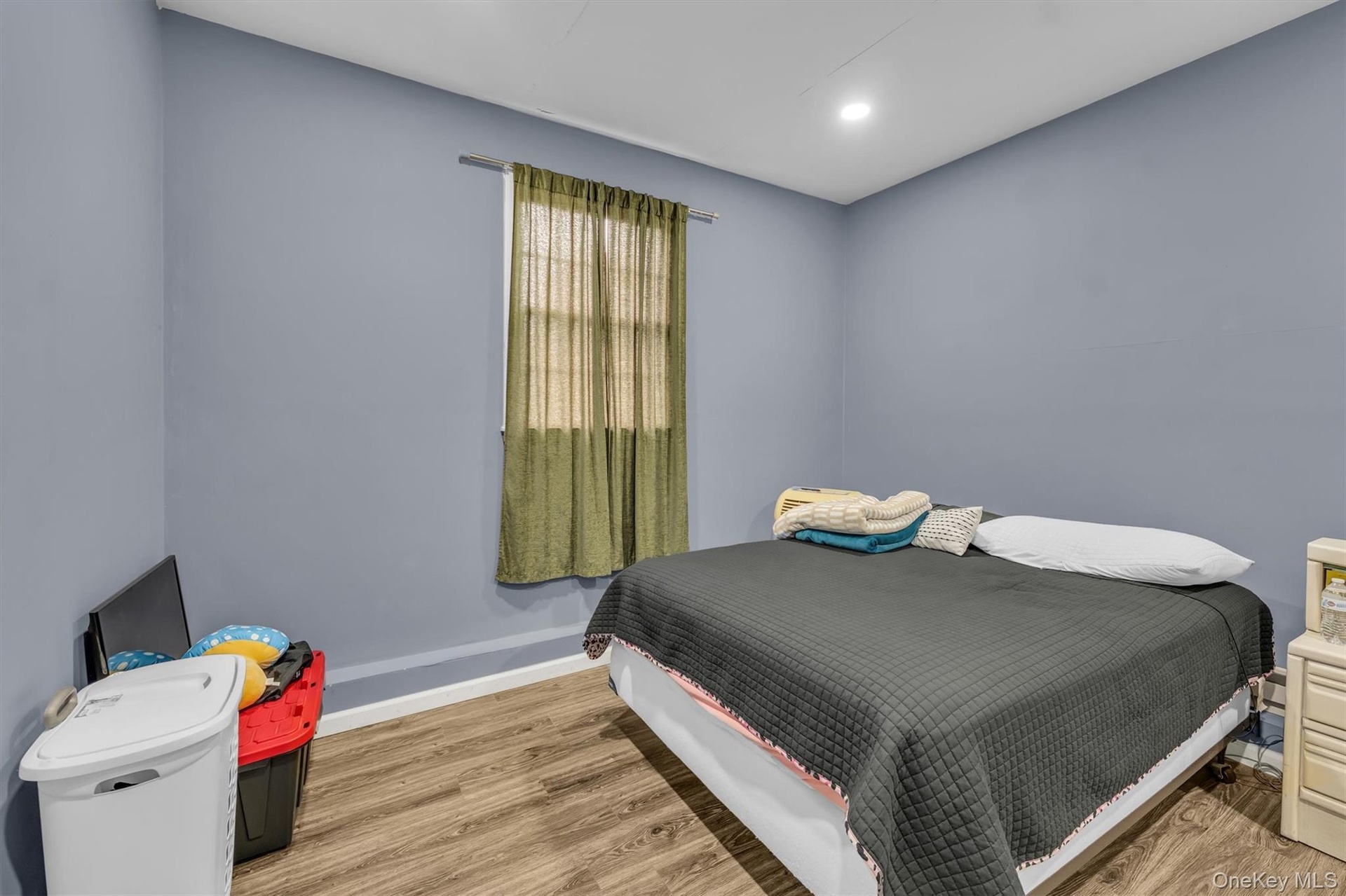 - Bedroom with light wood-style floors and recessed lighting