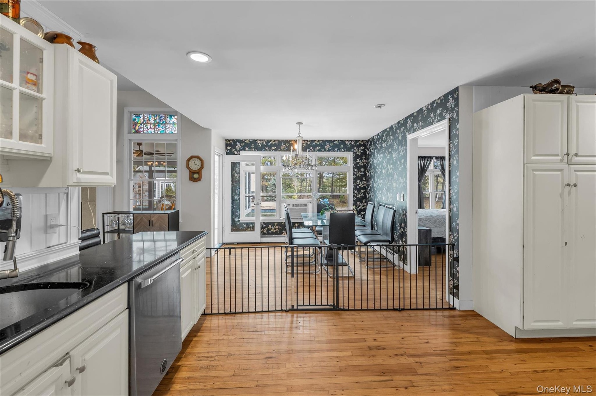 - Kitchen with dark countertops, white cabinetry, light wood-style flooring, decorative light fixtures, and glass insert cabinets