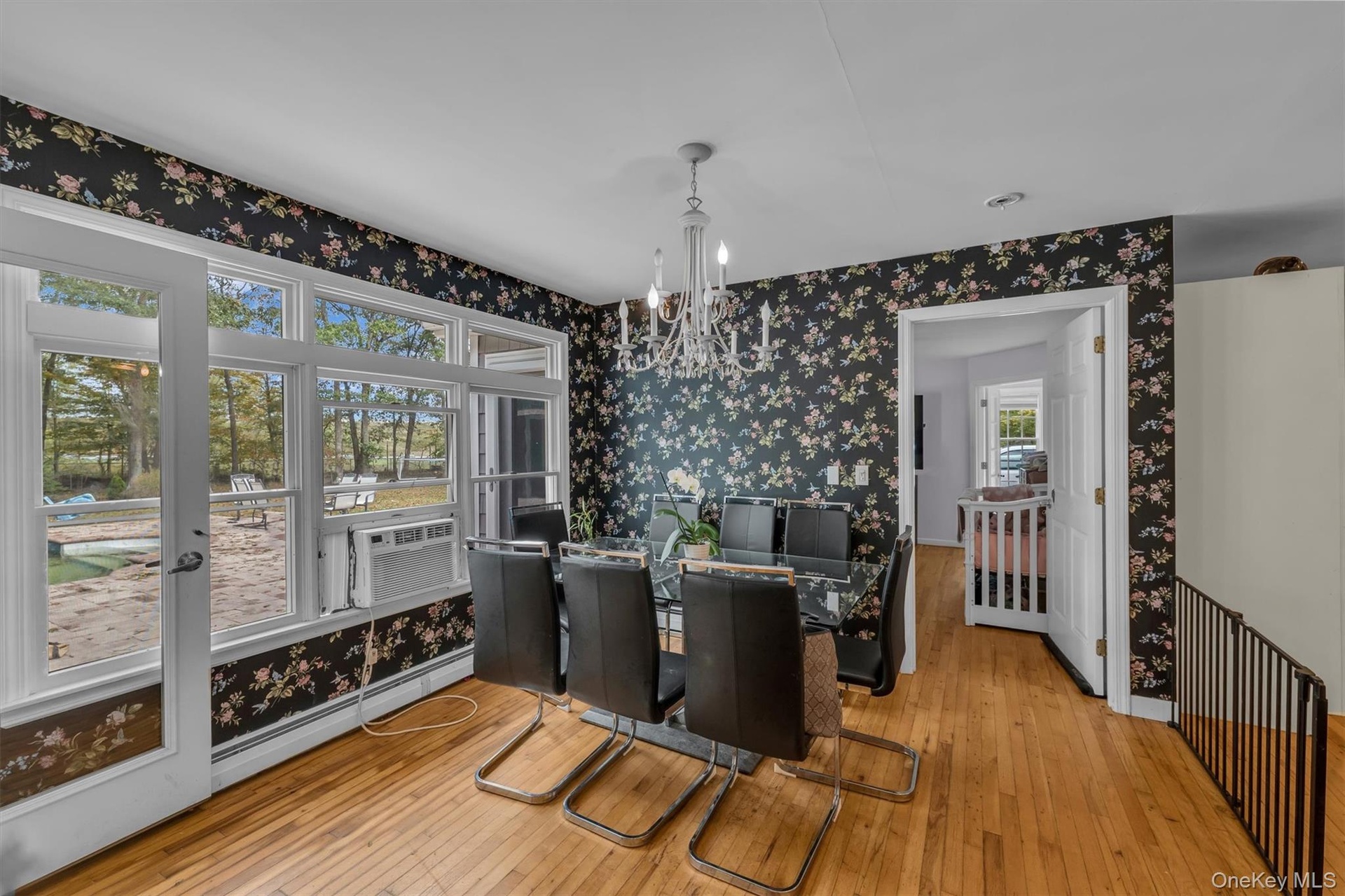 - Dining space featuring wallpapered walls, a chandelier, light wood-style flooring, baseboard heating, and cooling unit