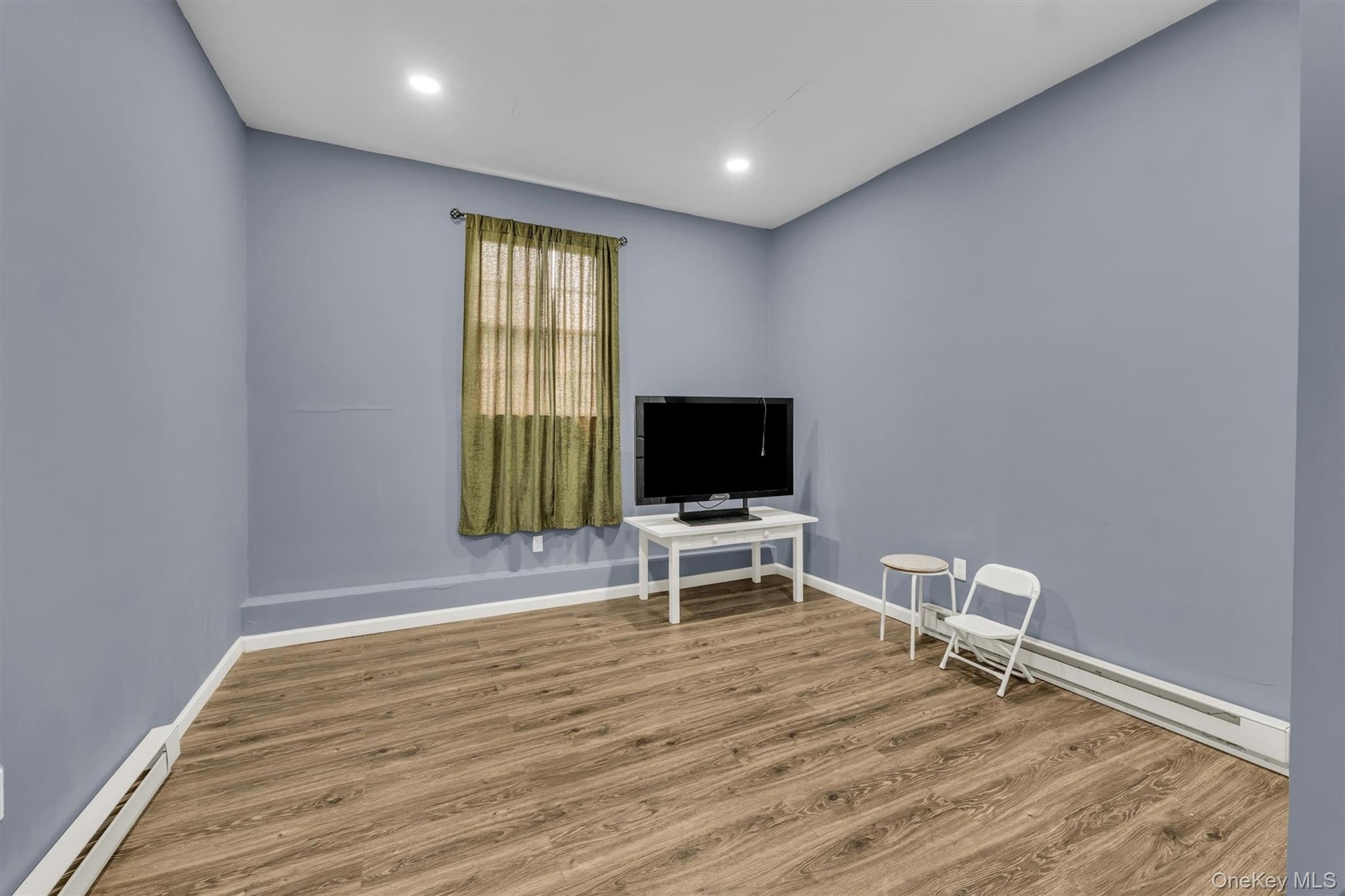 - Living area featuring a baseboard heating unit, wood finished floors, and recessed lighting