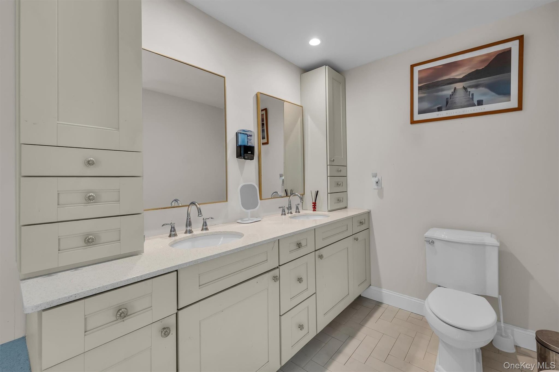 - Full bathroom featuring double vanity, recessed lighting, and light tile patterned floors