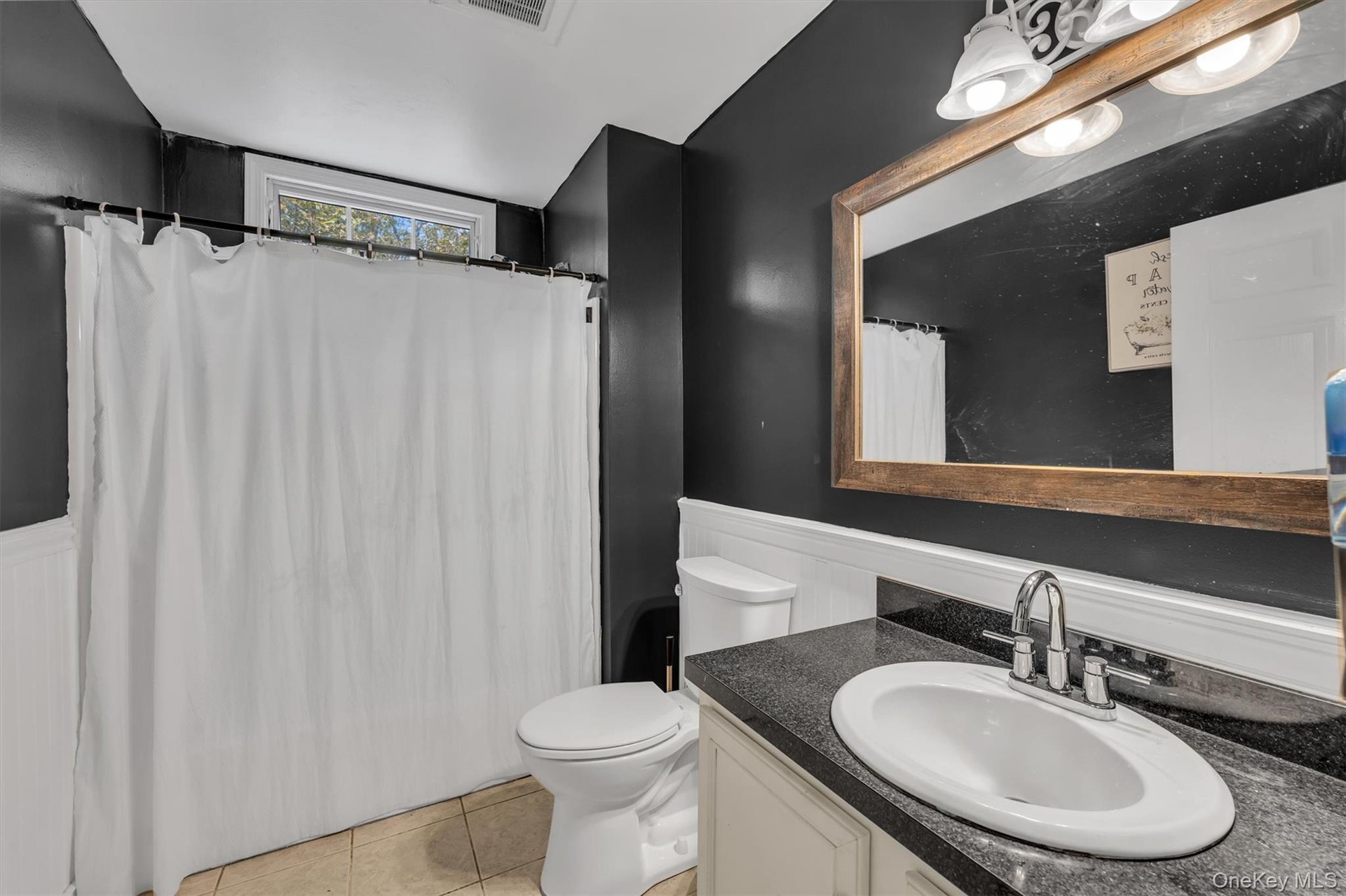 - Full bath with wainscoting, vanity, light tile patterned floors, and a shower with shower curtain