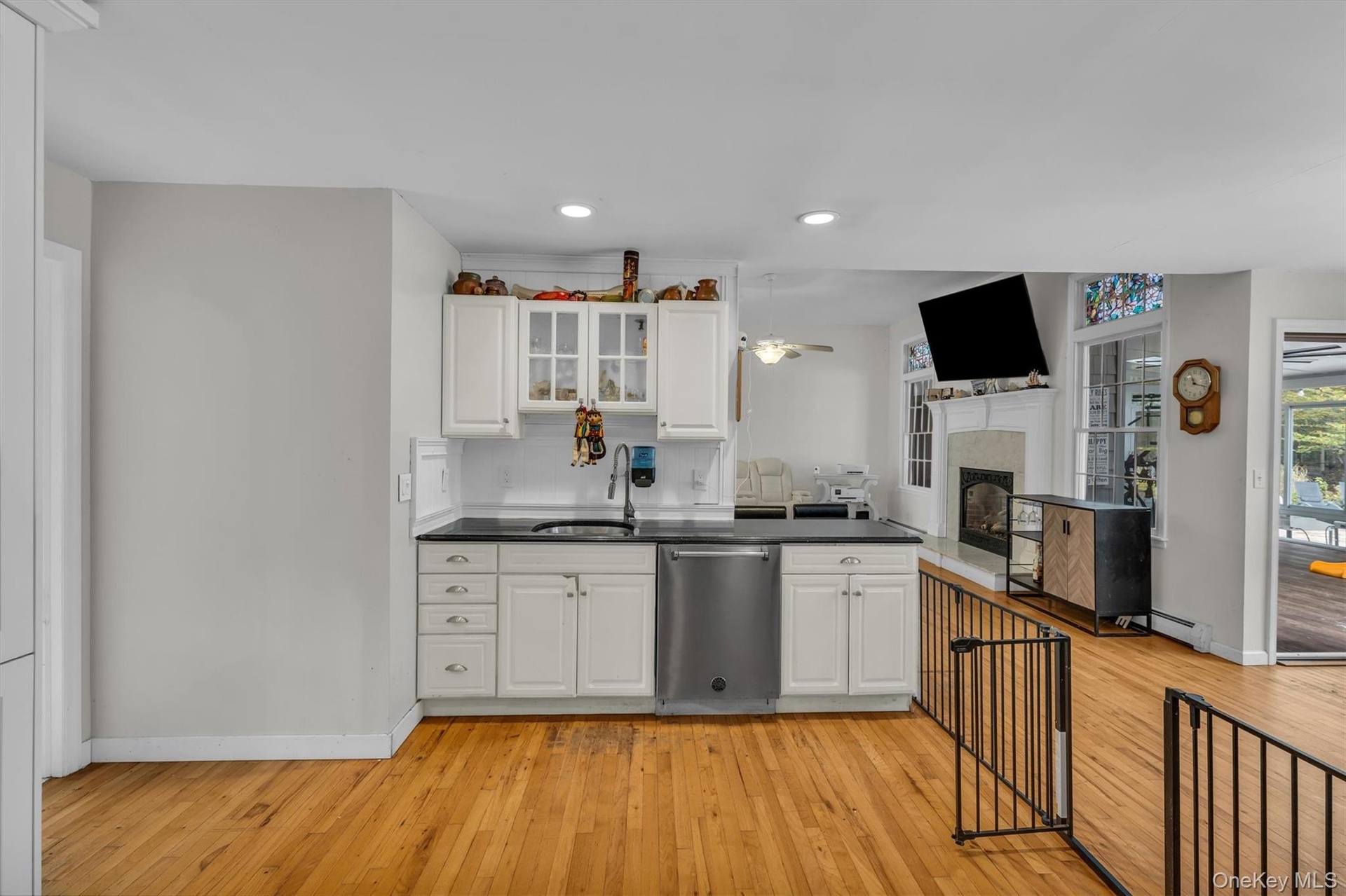 - Kitchen with recessed lighting, dishwasher, white cabinets, a fireplace, and light wood-style flooring