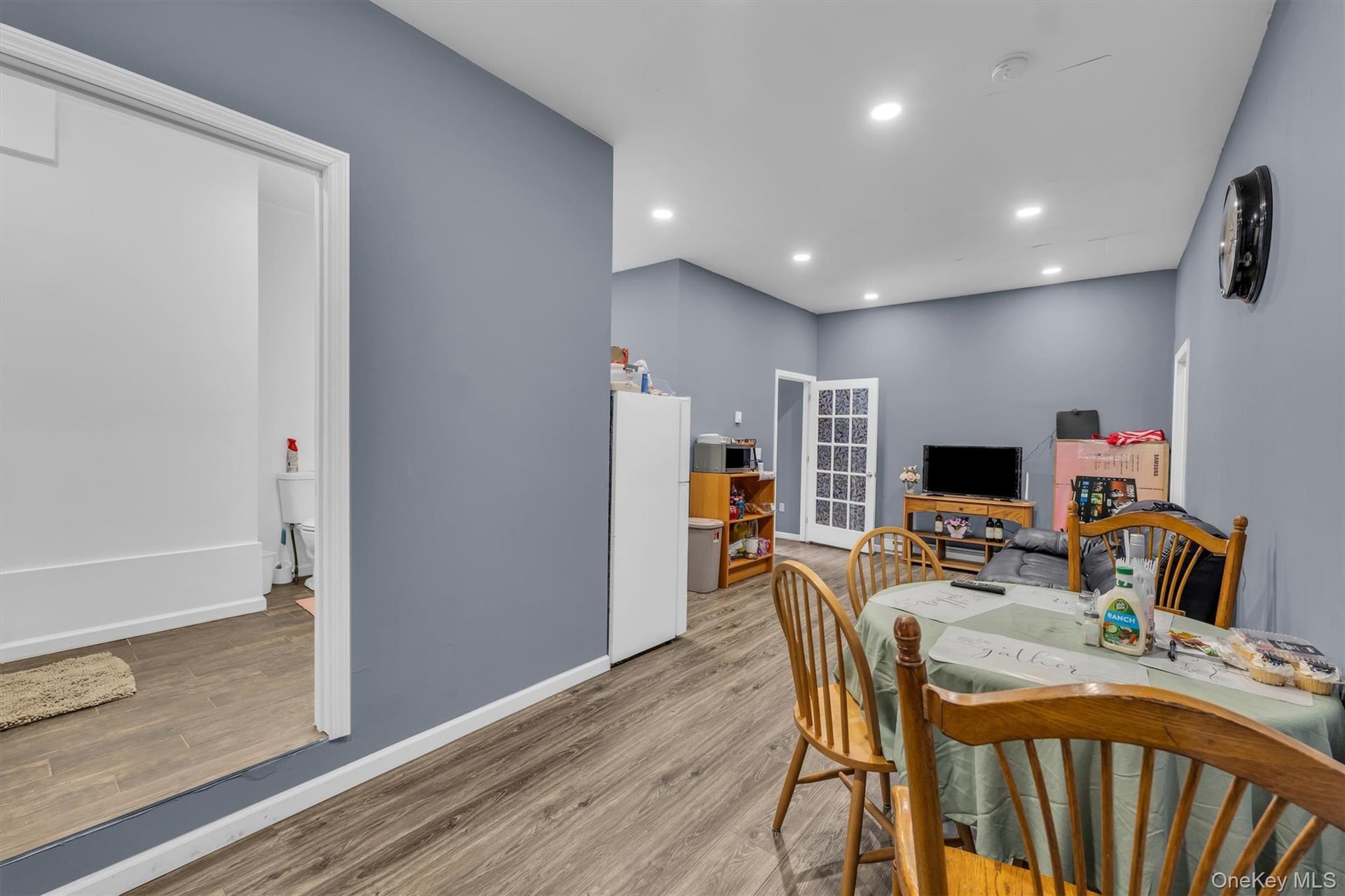 - Dining area with light wood-style floors and recessed lighting