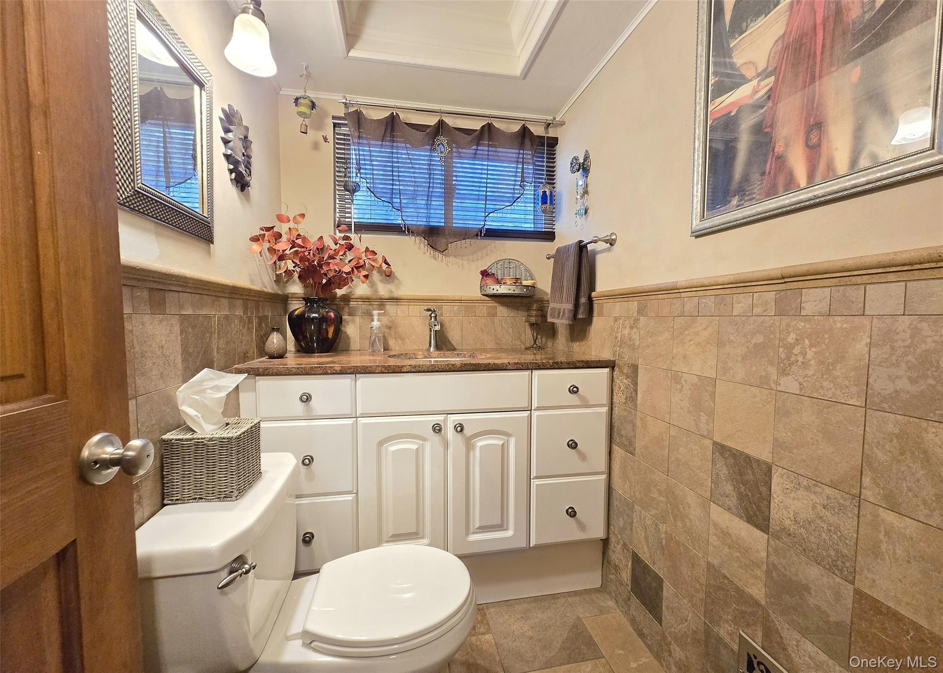 - Half bathroom featuring crown molding, tile walls, vanity, a raised ceiling, and wainscoting