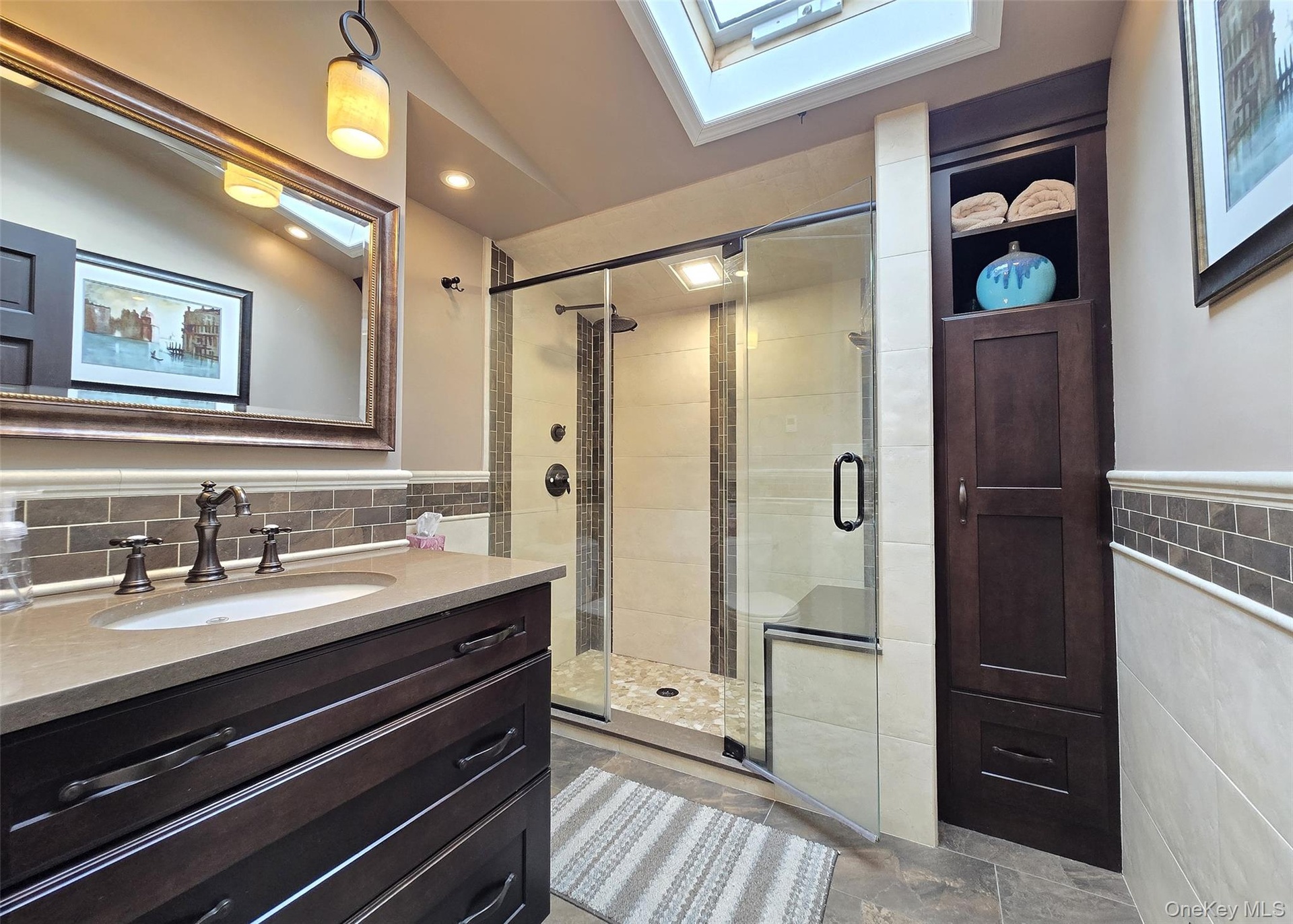 - Full bath with a skylight, tile walls, vanity, a stall shower, and a wainscoted wall