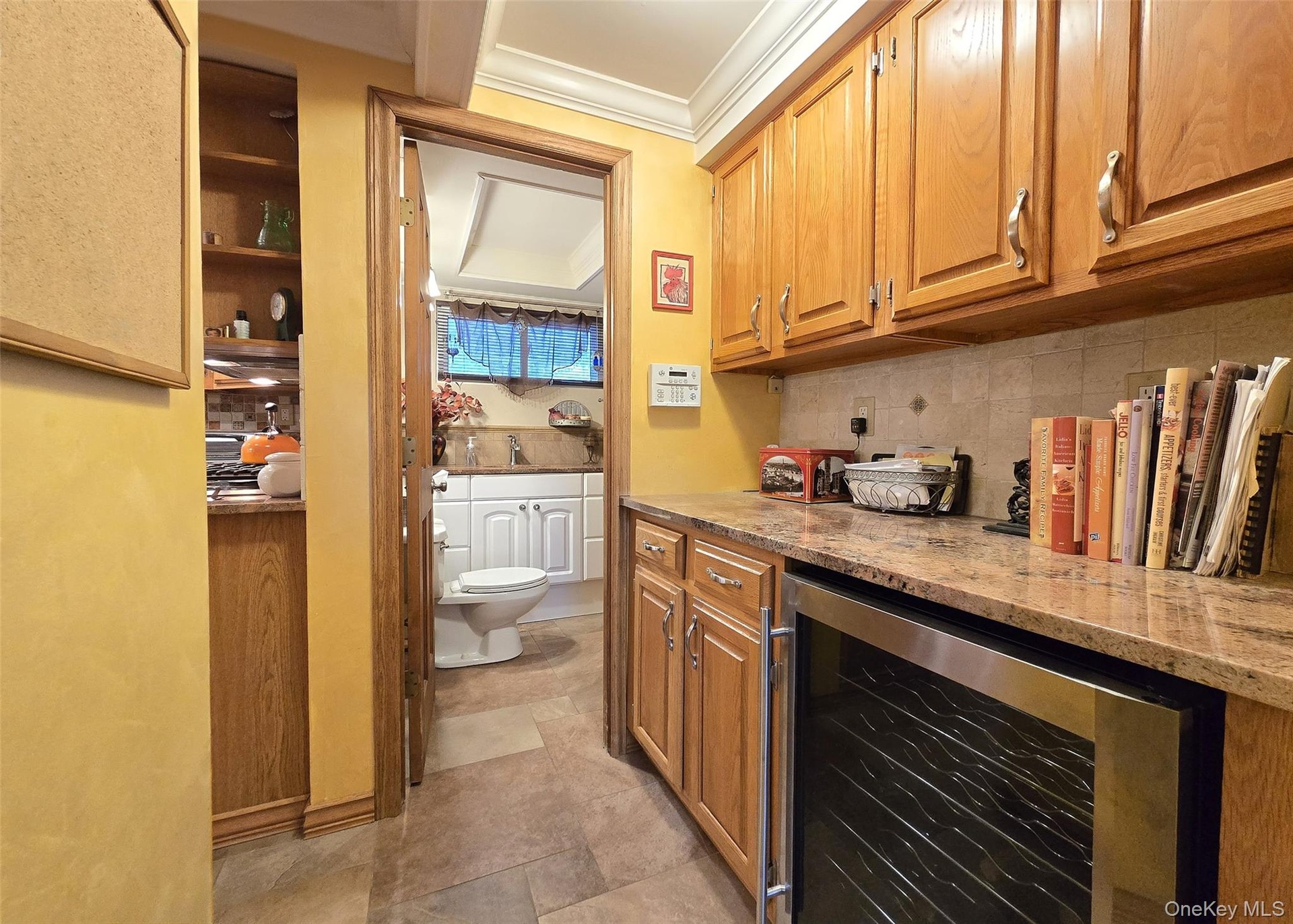 - Kitchen featuring brown cabinets, beverage cooler, ornamental molding, tasteful backsplash, and light stone countertops