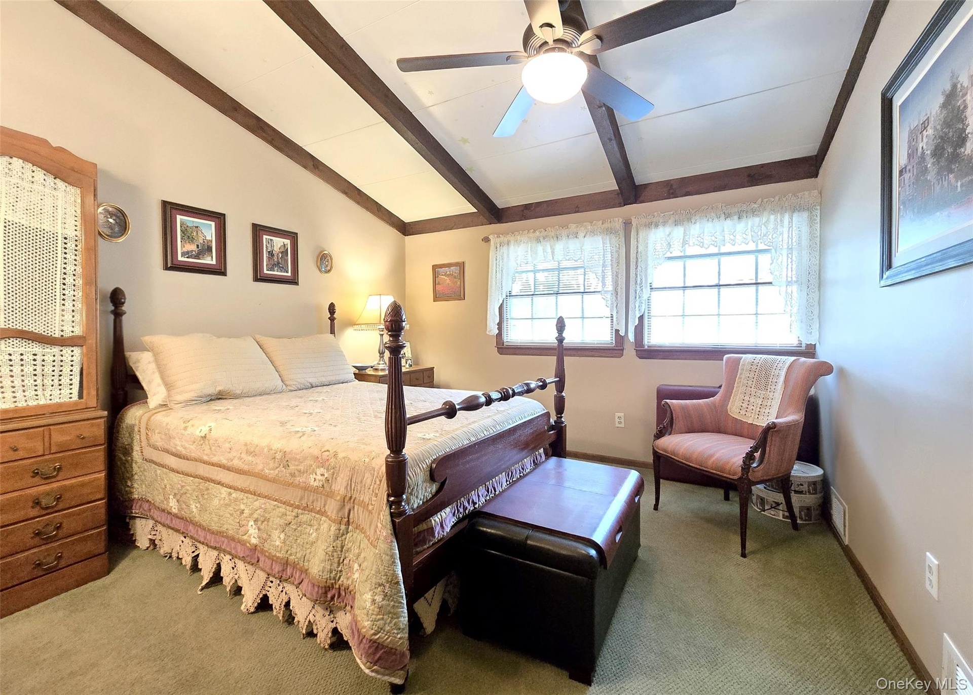 - Bedroom with carpet, access to exterior, and ceiling fan