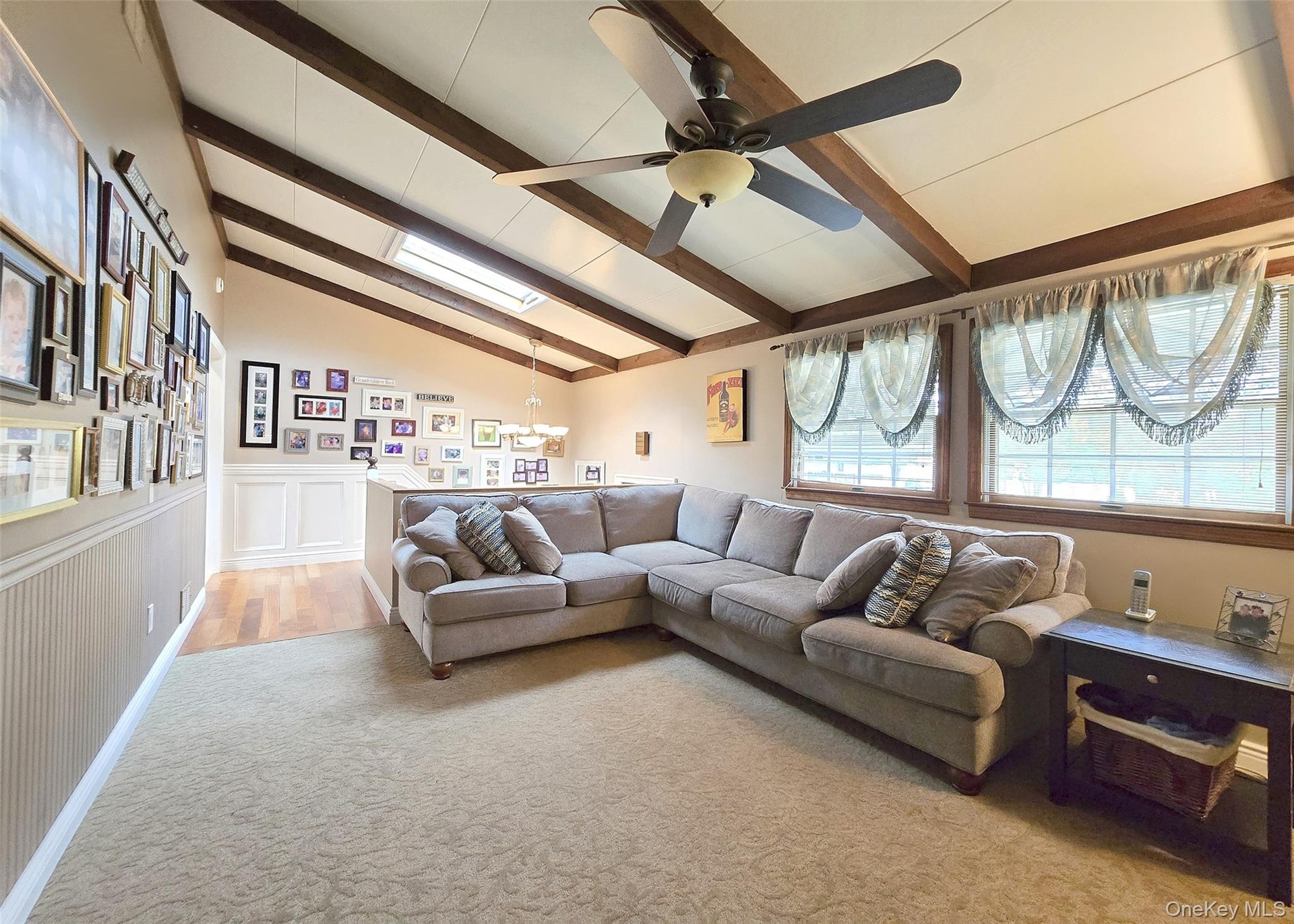 - Living area featuring light carpet, a wainscoted wall, a chandelier, and ceiling fan