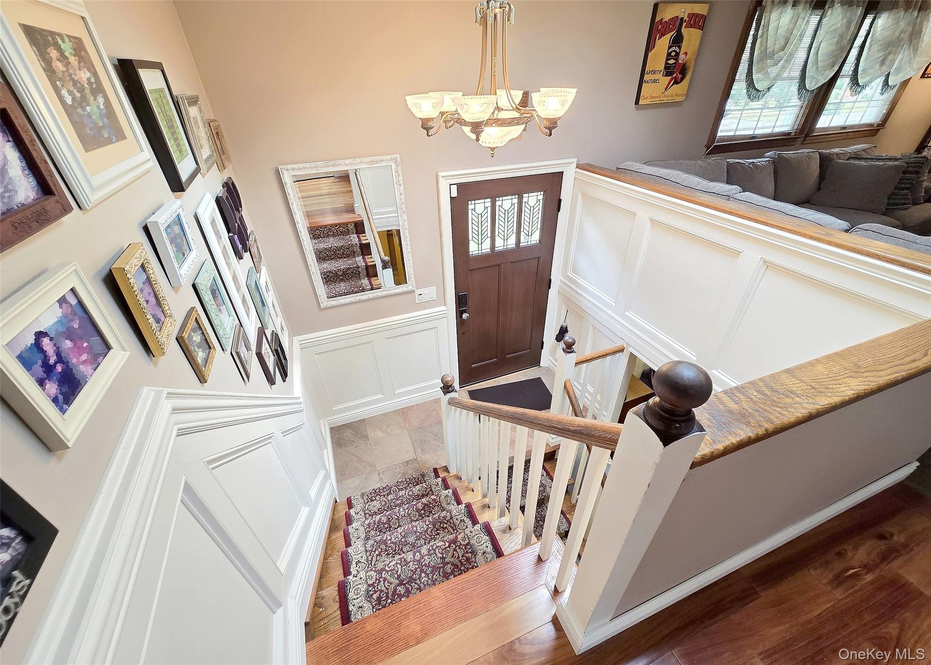 - Entryway with a decorative wall, wainscoting, stairs, a chandelier, and healthy amount of natural light