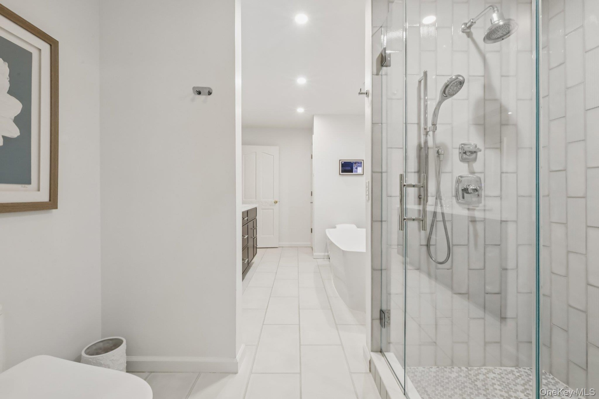 - Primary New Bathroom featuring a stall shower, vanity, a freestanding tub, light tile patterned floors, and recessed lighting